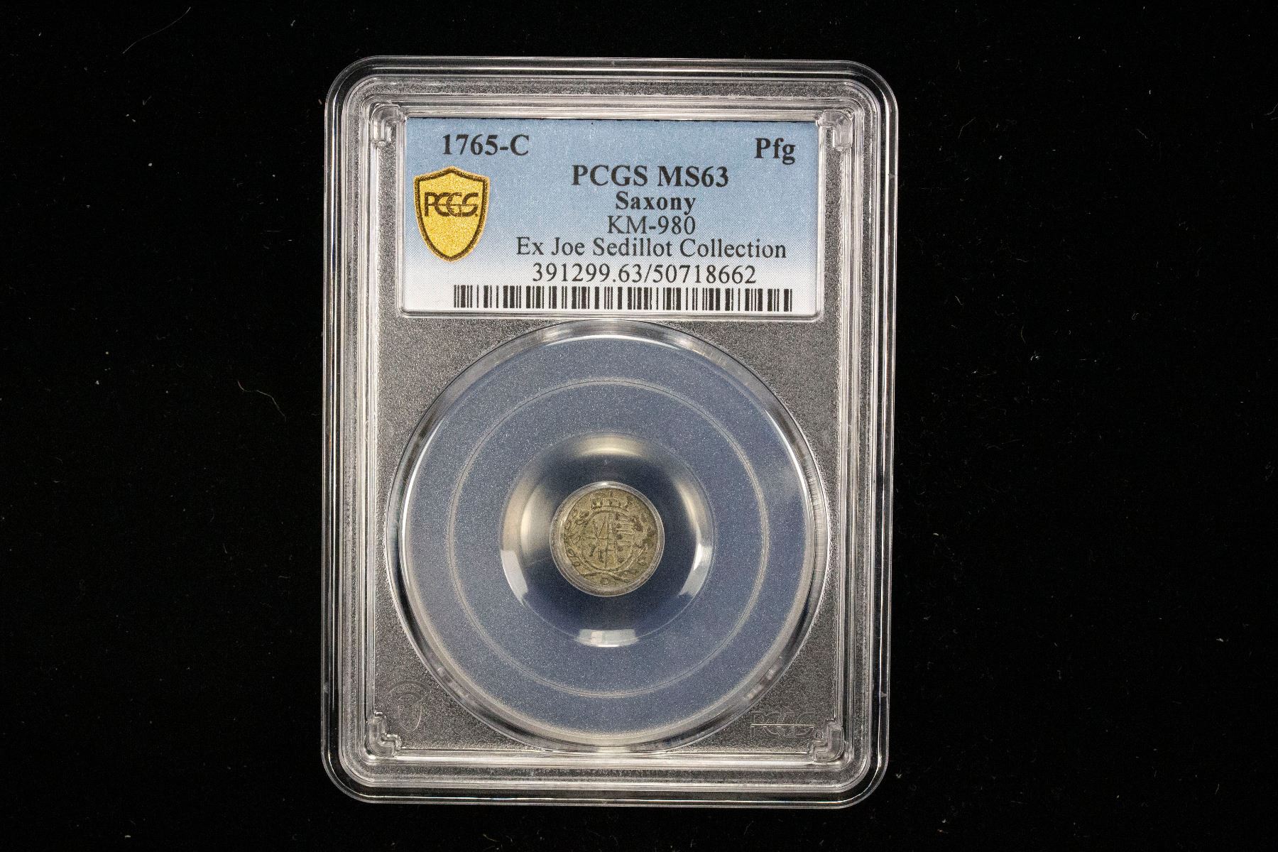 SAXONY: Friedrich August III, 1763-1806, BI pfennig, 1765-C, KM-980, C-93a, a lovely lustrous mint state example! PCGS graded MS63, ex Joe Sedillot Collection. The Electorate of Saxony had a diversified economy and a high level of prosperity, although it suffered major setbacks during and following both the Thirty Years' War of 1618-1648 and the Third Silesian War (Seven Years' War) of 1756-1763. Its middle-class structures were restricted in their development by the nobility and the administration and tended to lag behind contemporary western nations such as the Dutch Republic. Important humanistic and educational impulses came from Saxony through the Reformation that started in the Electorate in the early 1500s. By the 18th century, Saxon culture and arts began to flourish.
