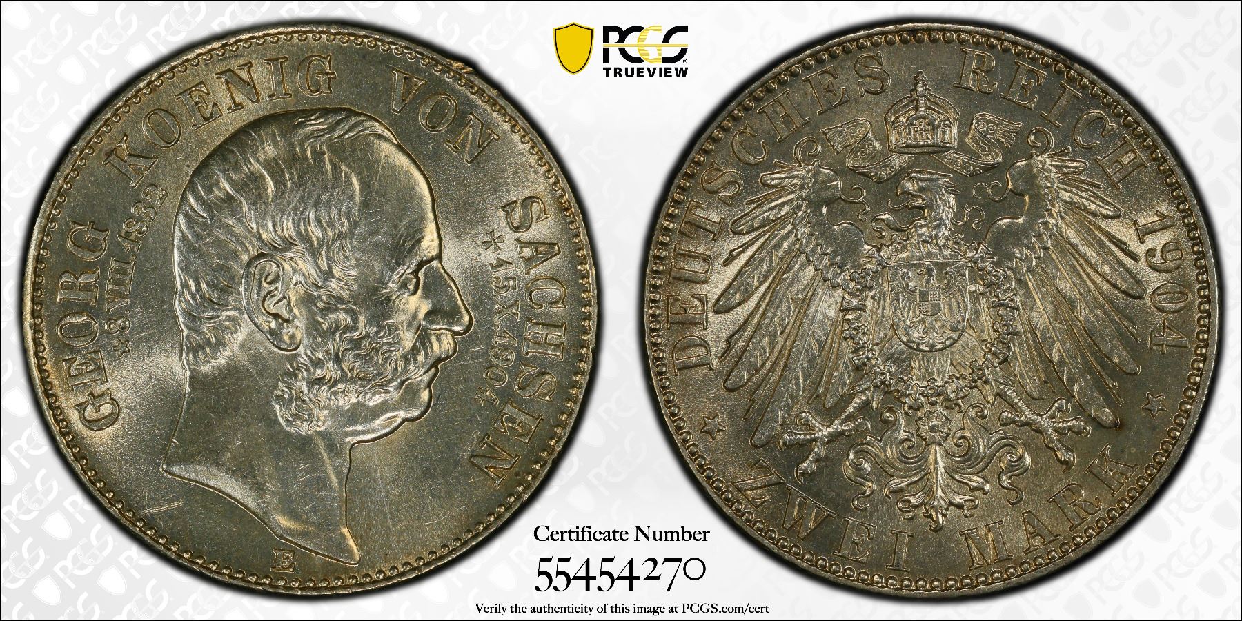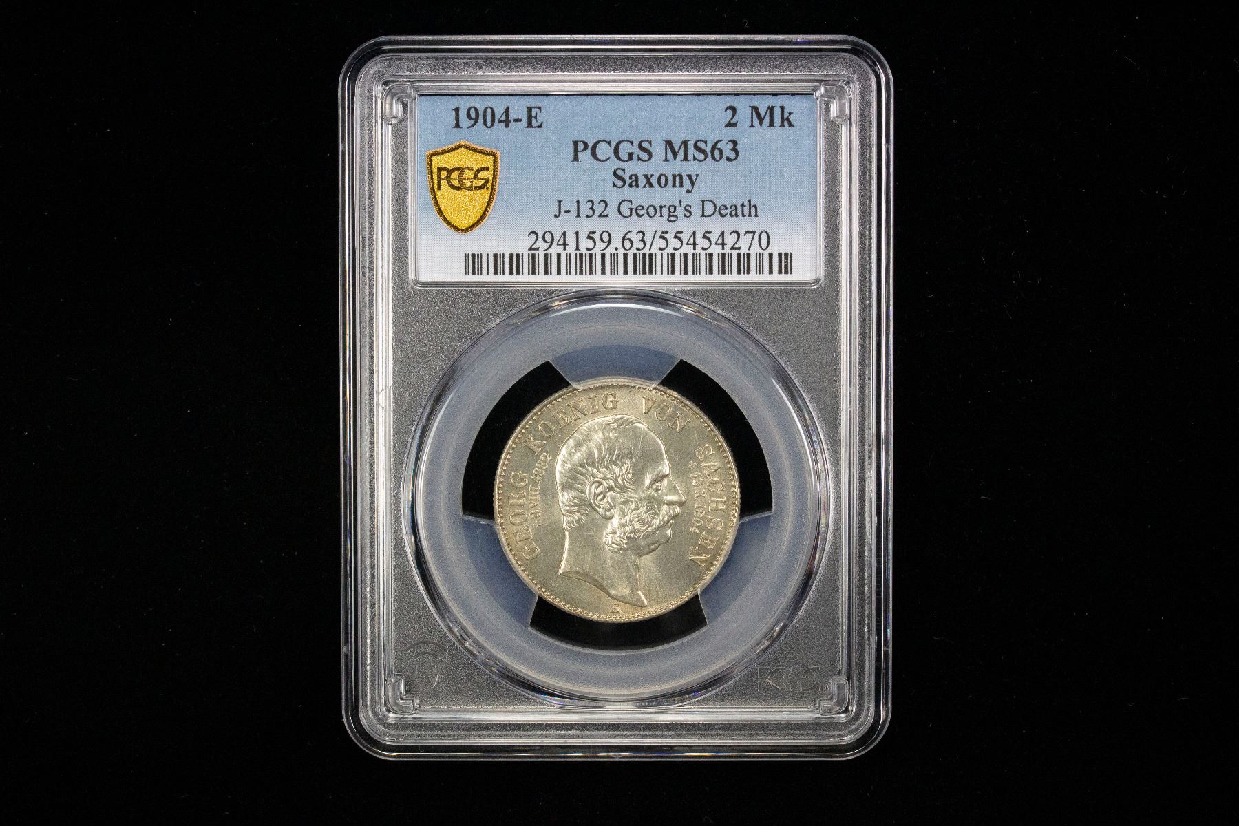 SAXONY: Friedrich August III, 1904–1918, AR 2 mark, 1904-E, KM-1261, Y-191, J-132, Death of King Georg, a lovely mint state example! PCGS graded MS63. George (8 August 1832 – 15 October 1904) was king of Saxony from 1902 to 1904 and a member of the House of Wettin.