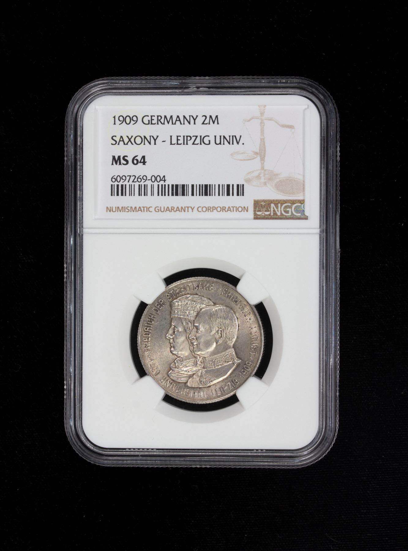 SAXONY: Friedrich August III, 1904-1918, AR 2 mark, 1909, KM-1268, J-138, 500th Anniversary of the Leipzig University, a wonderful example! NGC graded MS64.
