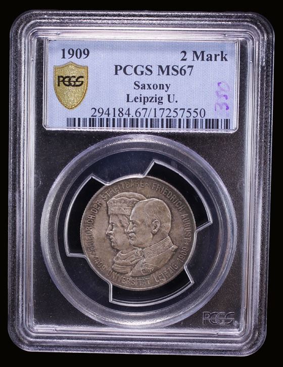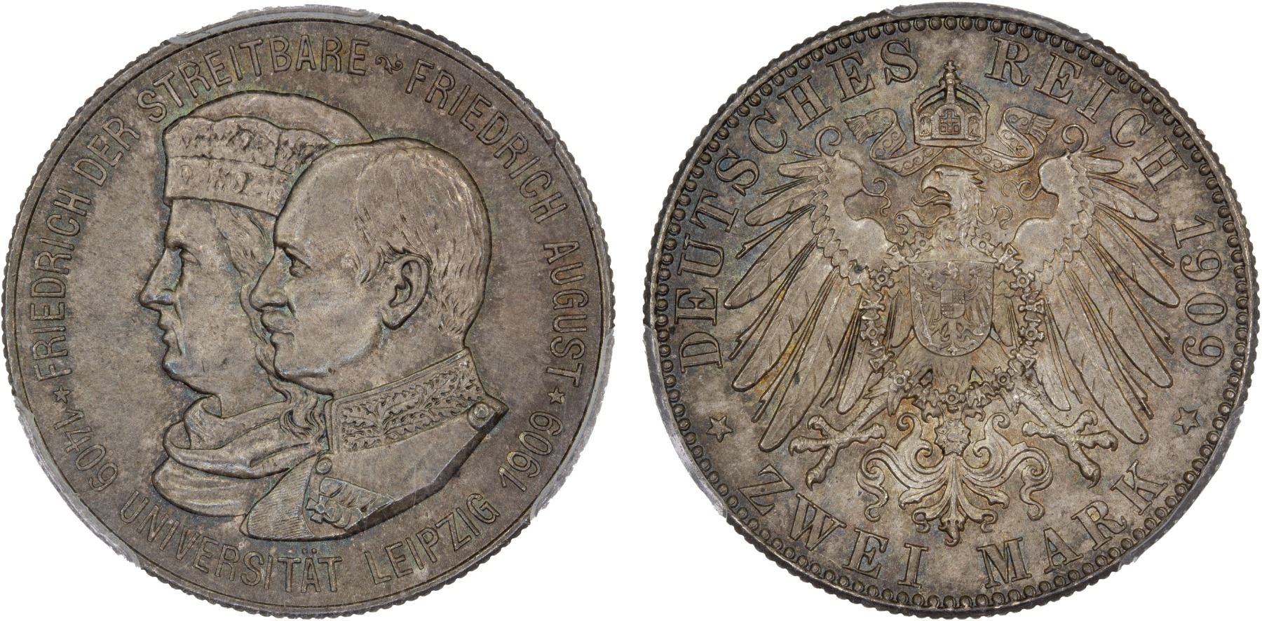 SAXONY: Friedrich August III, 1904-1918, AR 2 mark, 1909, KM-1268, 500th Anniversary-Leipzig University, beautifully toned, a lovely example! PCGS graded MS67.