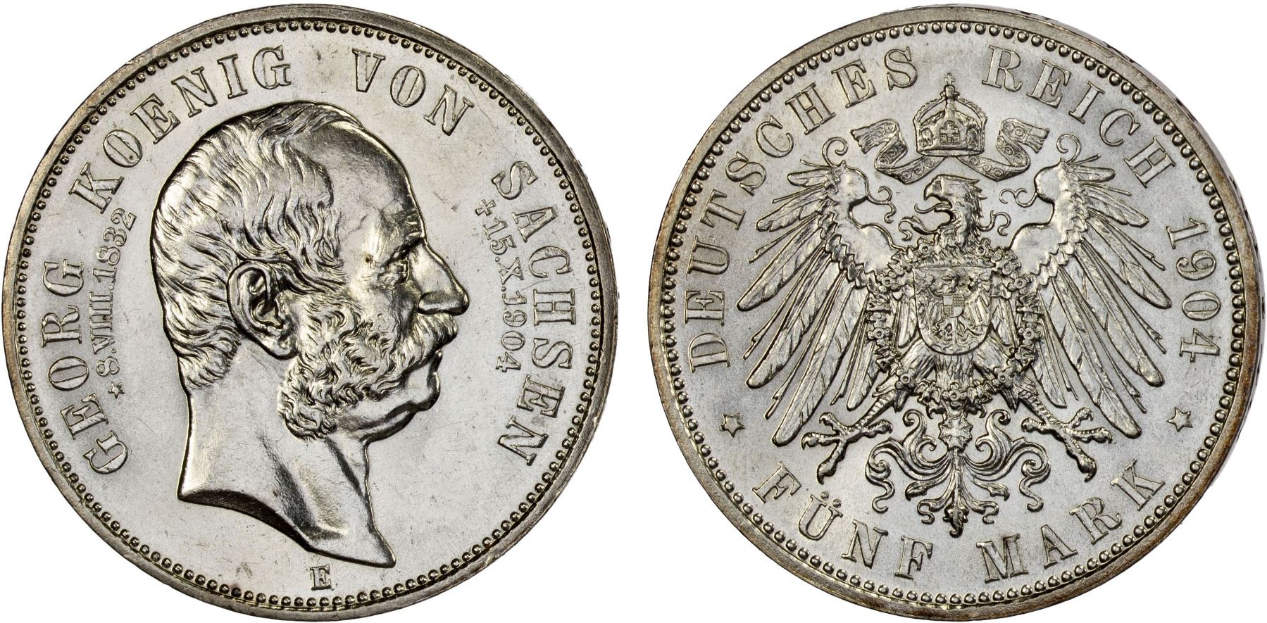 SAXONY: Friedrich August III, 1904–1918, AR 5 mark, 1904-E, AU