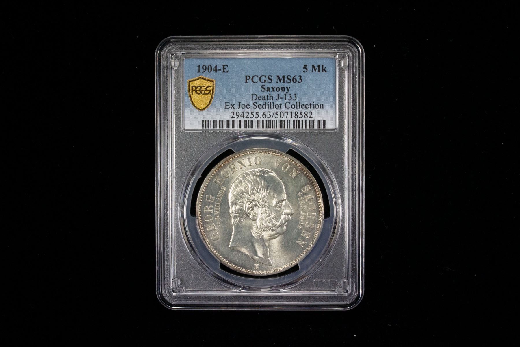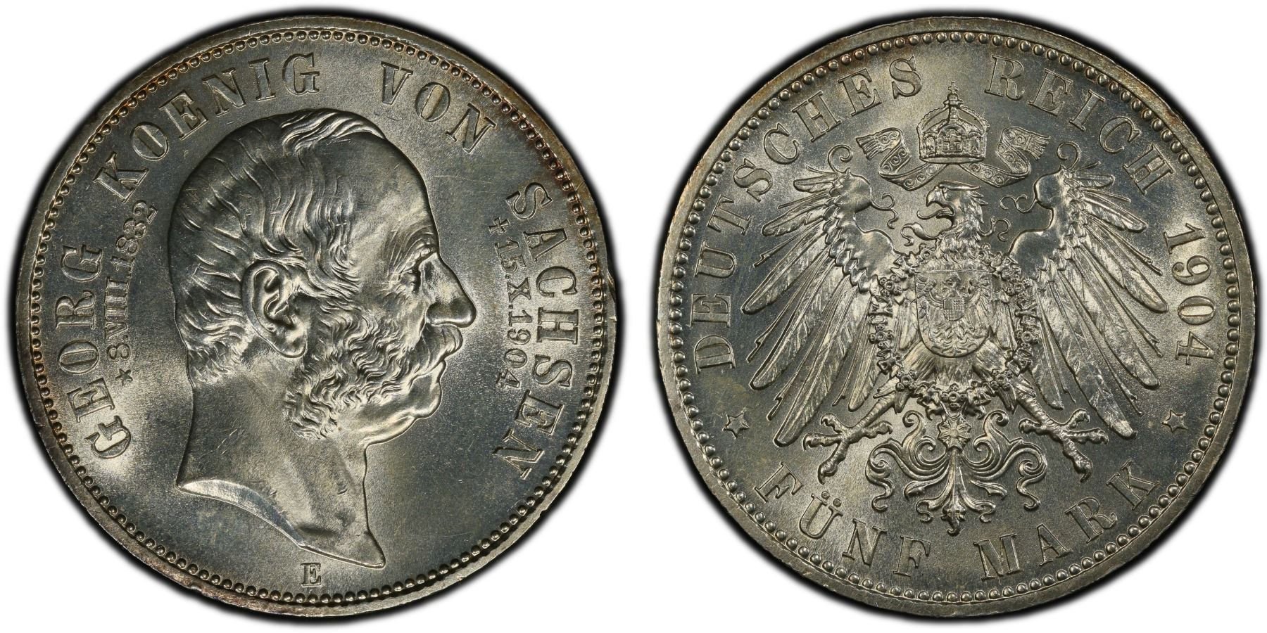 SAXONY: Friedrich August III, 1904-1918, AR 5 mark, 1904-E, KM-1262, Y-192, J-133, Dav-904, commemorating the Death of King Georg, medallic alignment, a lovely lustrous mint state example! PCGS graded MS63, ex Joe Sedillot Collection.
