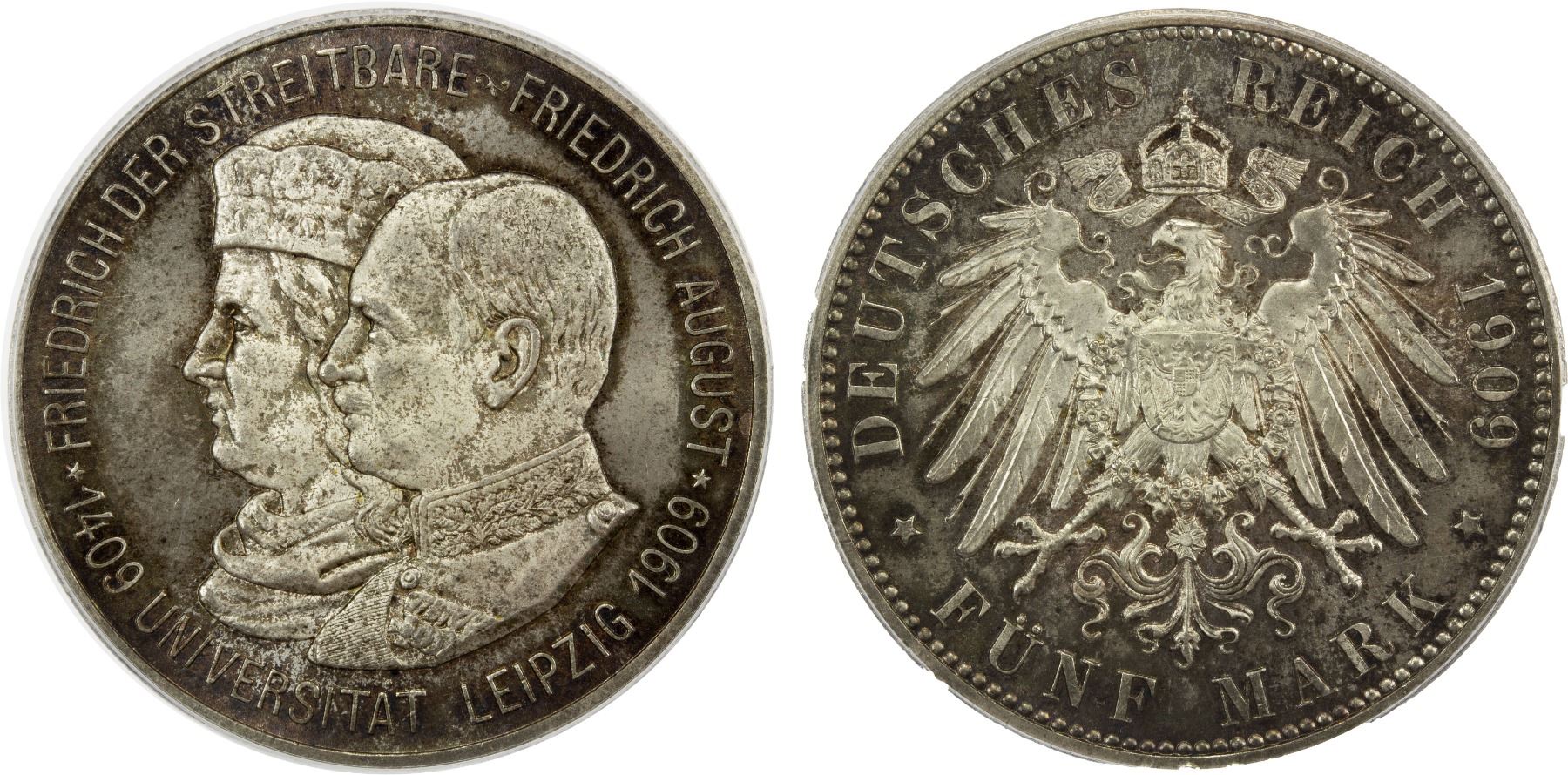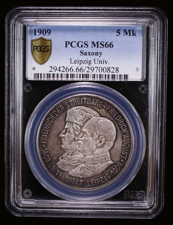 SAXONY: Friedrich August III, 1904-1918, AR 5 mark, 1909, KM-1269, Jaeger-139, 500th Anniversary-Leipzig University, original tone, a lovely example! PCGS graded MS66.