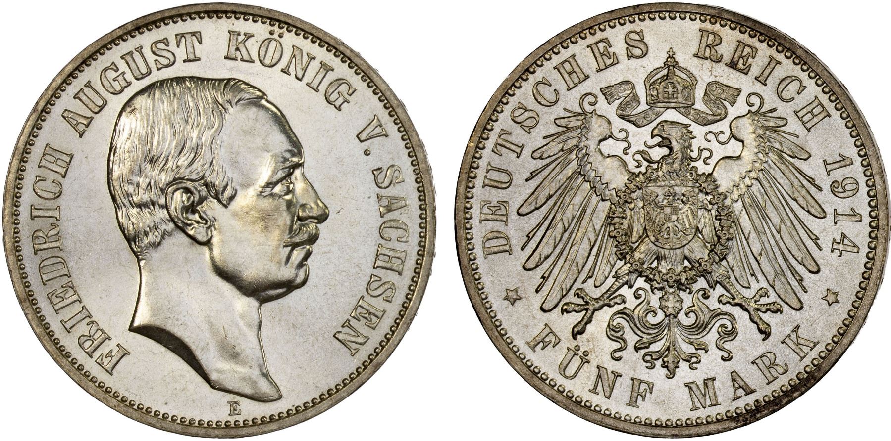 SAXONY: Friedrich August III, 1904-1918, AR 5 mark, 1914-E, Unc