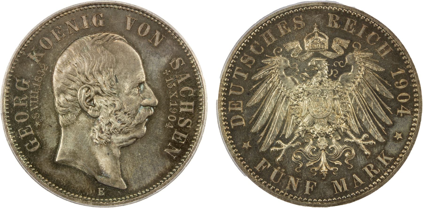 SAXONY: Friedrich August III, 1904-1918, AR 5 mark, Muldenhutten, 1904-E, PCGS MS66