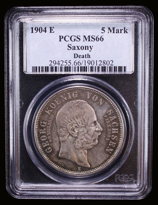 SAXONY: Friedrich August III, 1904-1918, AR 5 mark, Muldenhutten, 1904-E, KM-1262, Jaeger-133, Dav-904, Death of Georg, beautifully toned, wonderful eye appeal, a lovely example! PCGS graded MS66.