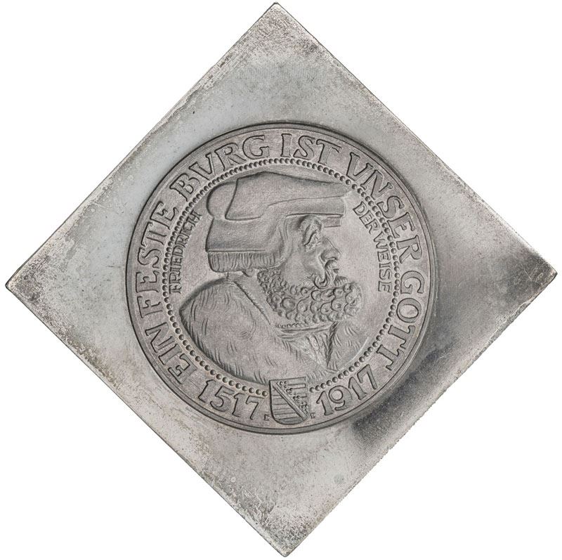 SAXONY: Friedrich August III, 1904-1918, AR klippe 3 mark (20.46g), 1917, as KM-1276, 60mm measured diagonally, uniface restrike of obverse of KM-1276, Jubilee of Reformation, matte finish, prooflike finish on margins and reverse, 925 stamped in small numbers on reverse, beautifully toned, Unc. Photo size reduced.