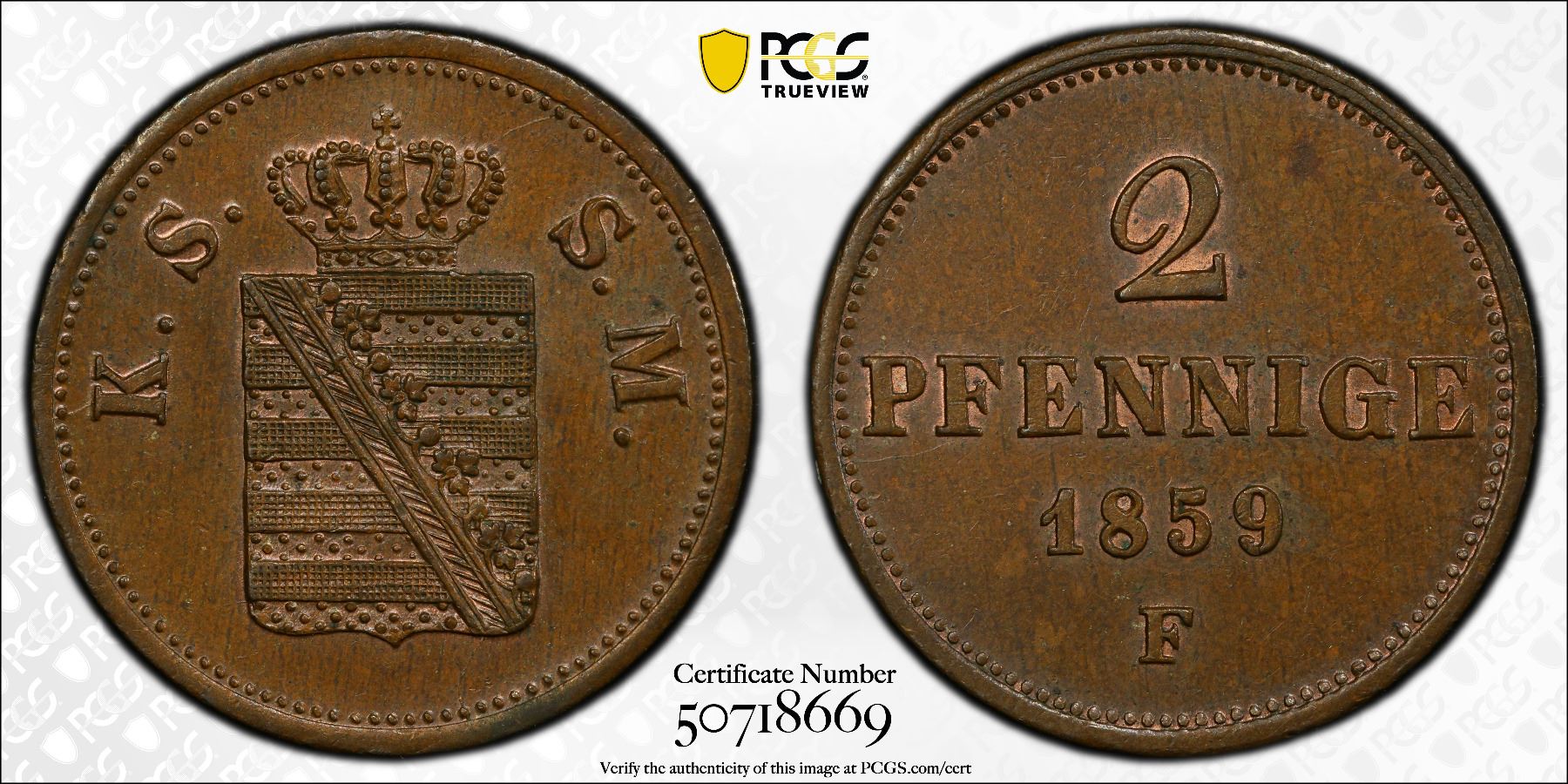 SAXONY: Johann, 1854-1873, AE 2 pfennig, 1859-F, PCGS MS63 BN