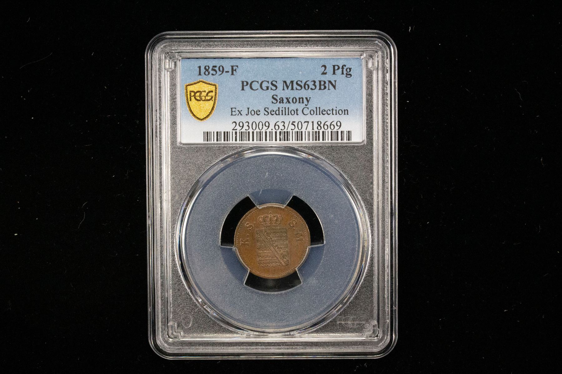 SAXONY: Johann, 1854-1873, AE 2 pfennig, 1859-F, KM-1185, C-249, a lovely lustrous chocolate brown mint state example! PCGS graded MS63 BN, ex Joe Sedillot Collection. Beyond his political work, Johann was busy with literature. Under the pseudonym Philalethes he translated to German Dante's Divine Comedy; some parts of this work were placed in the Schloss Weesenstein. The Dresden district of Johannstadt was named after him.