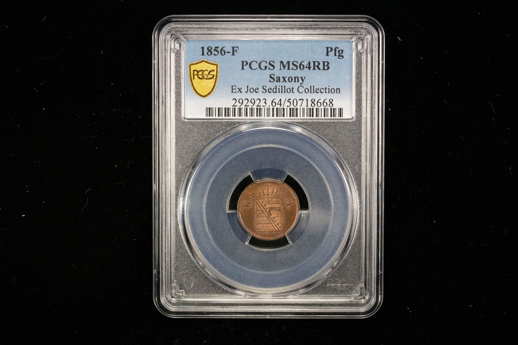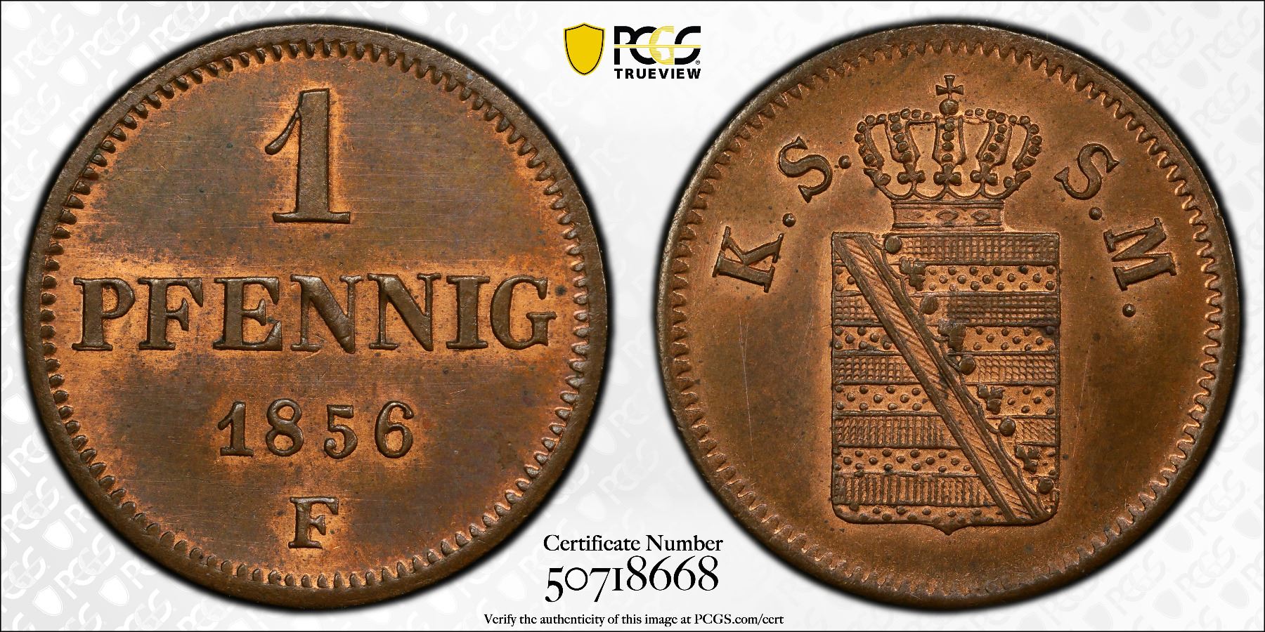 SAXONY: Johann, 1854-1873, AE pfennig, 1856-F, PCGS MS64 RB