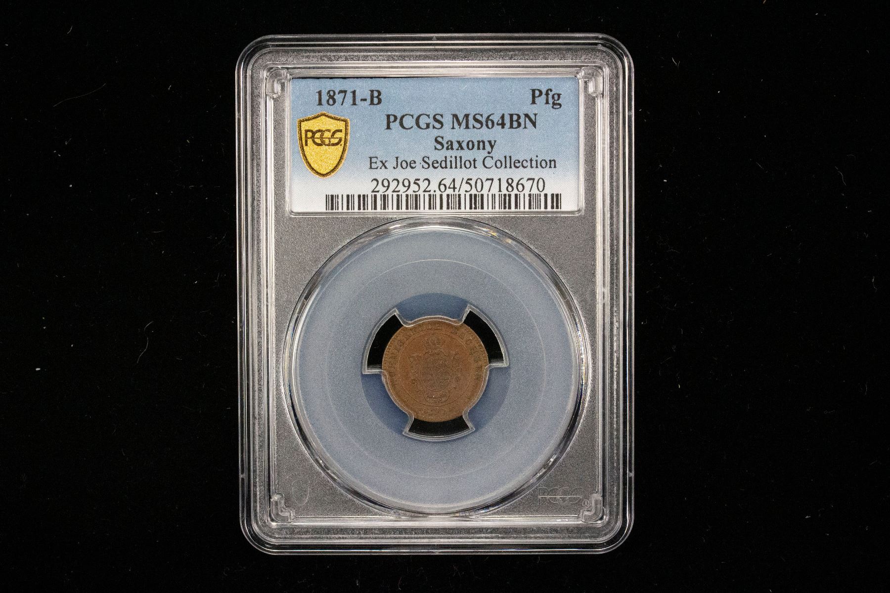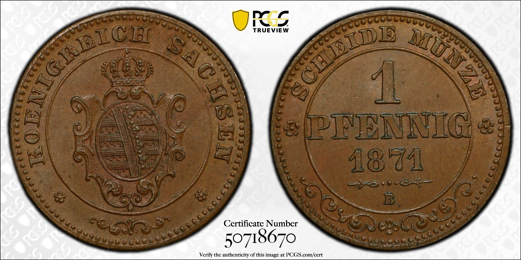 SAXONY: Johann, 1854-1873, AE pfennig, 1871-B, PCGS MS64 BN