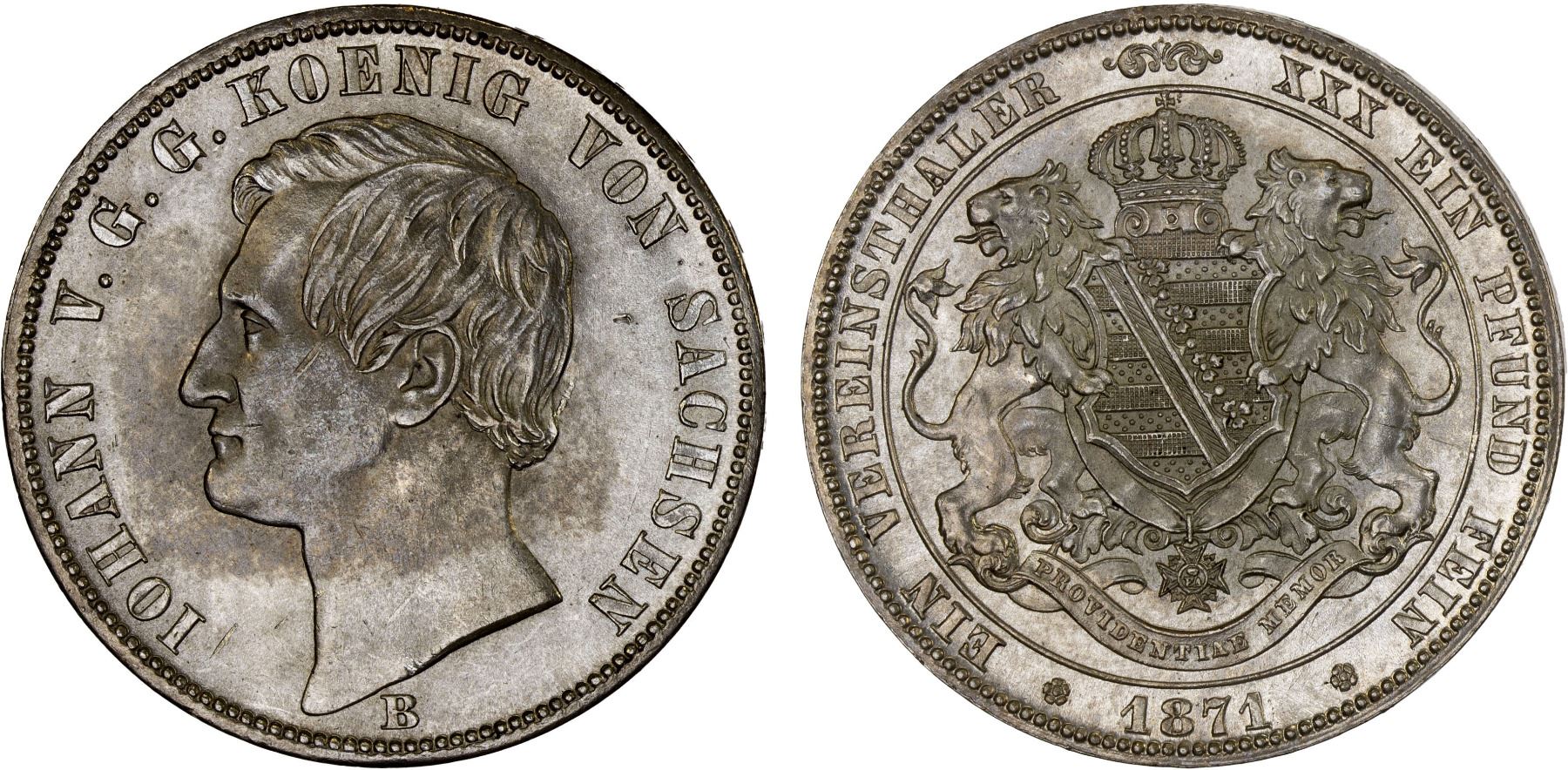 SAXONY: Johann, 1854-1873, AR vereinsthaler, 1871-B, Unc