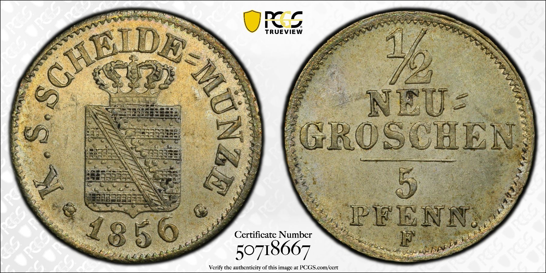 SAXONY: Johann, 1854-1873, BI 1/2 neugroschen / 5 pfennig, 1856-F, PCGS MS63