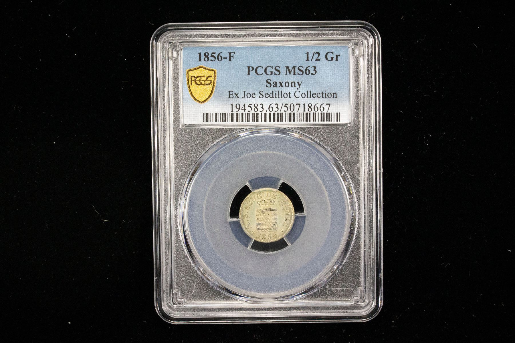 SAXONY: Johann, 1854-1873, BI 1/2 neugroschen / 5 pfennig, 1856-F, KM-1158, C-253, a lovely lustrous argent mint state example! PCGS graded MS63, ex Joe Sedillot Collection. Beyond his political work, Johann was busy with literature. Under the pseudonym Philalethes he translated to German Dante's Divine Comedy; some parts of this work were placed in the Schloss Weesenstein. The Dresden district of Johannstadt was named after him.