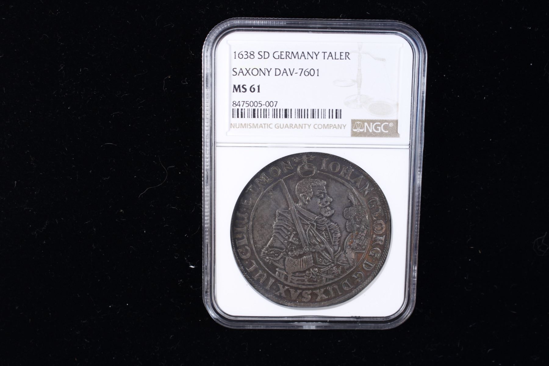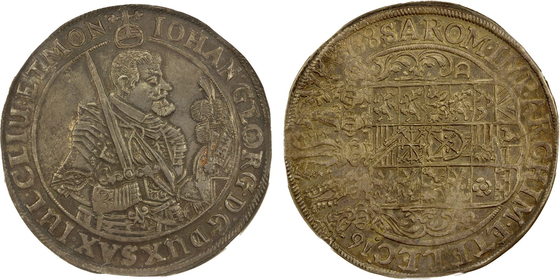 SAXONY: Johann Georg I, 1591-1656, AR thaler, Dresden, 1638, KM-132, Dav-7601, mintmaster initials HI, a pleasant toned lustrous mint state example, NGC graded MS61.