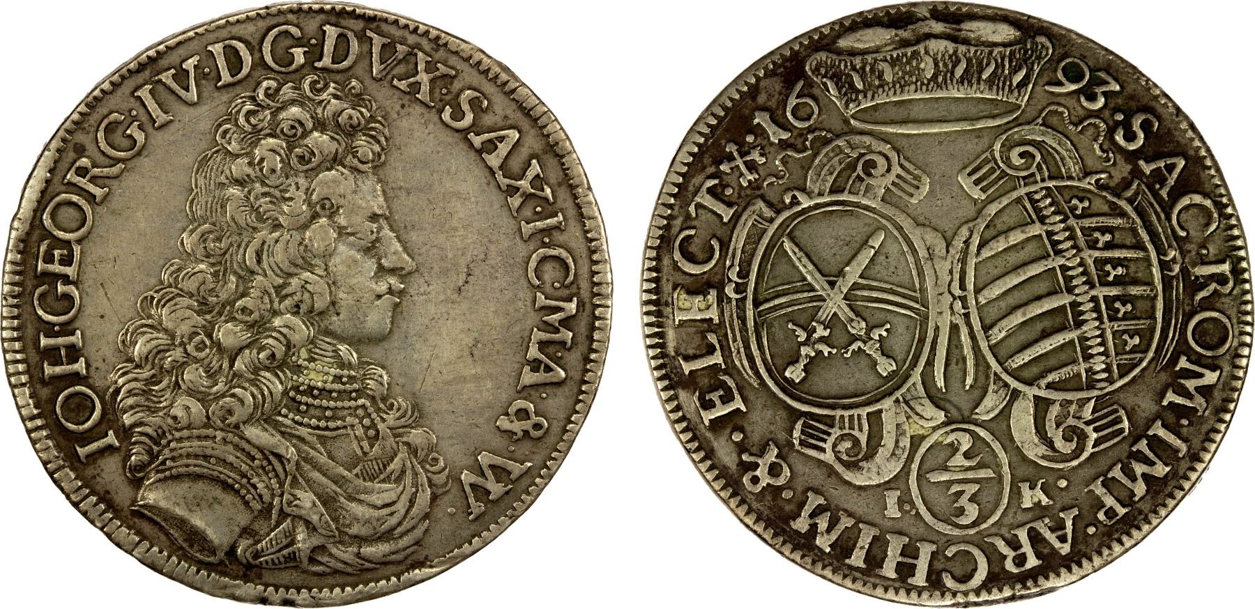 SAXONY: Johann Georg IV, 1691-1694, AR 2/3 thaler, 1693-IK, KM-641, Dresden Mint, VF-XF, ex Almer H. Orr III Collection, ex SARC Auction 48, Lot 2164.