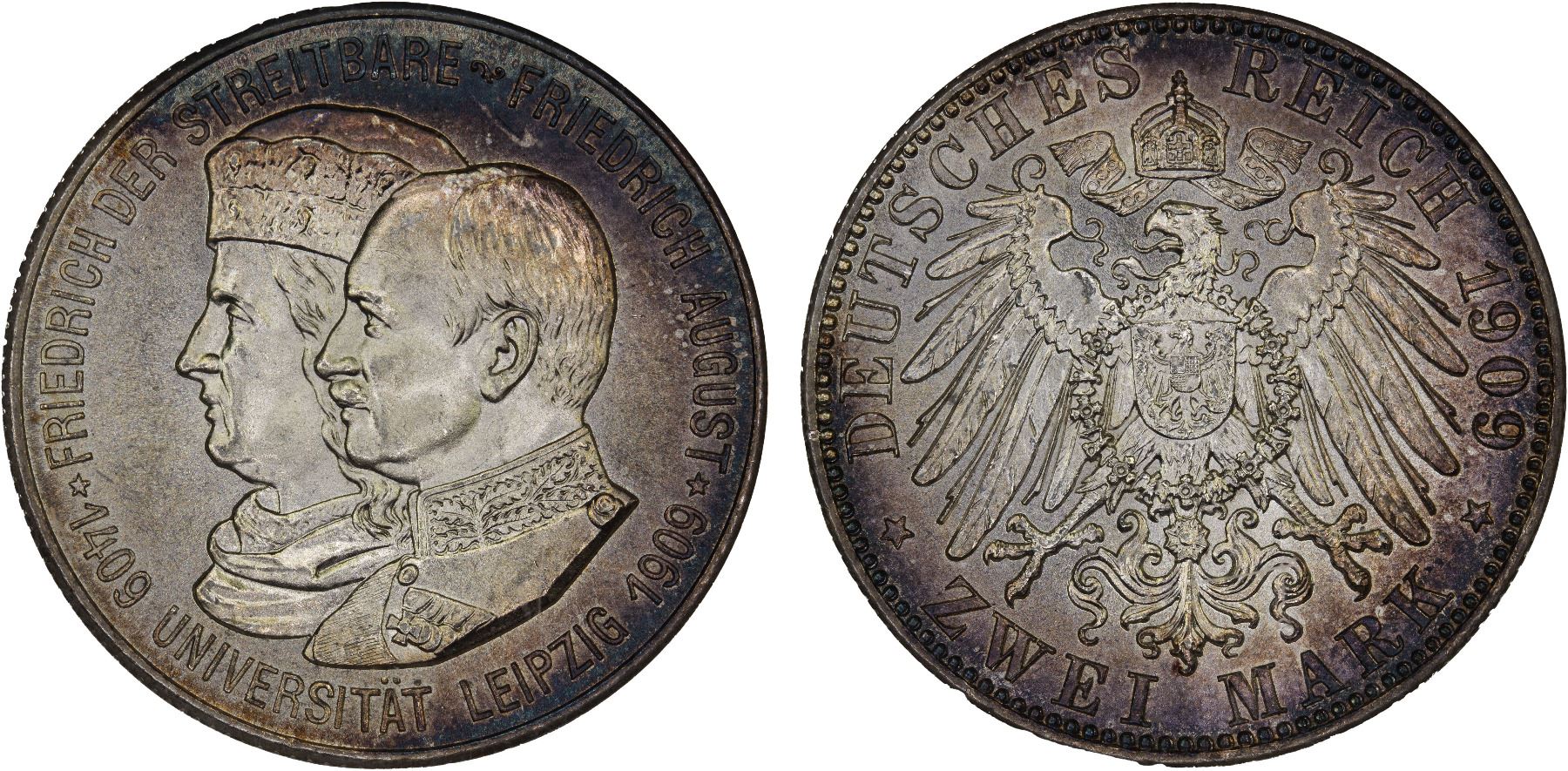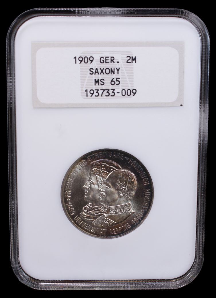 SAXONY: Kaiserreich, AR 2 mark, 1909, KM-1268, 500th Anniversary of Leipzig University, light peripheral tone, great eye appeal, old NGC holder, NGC graded MS65.