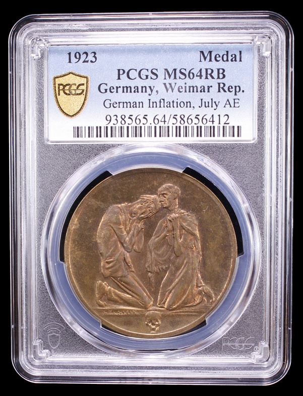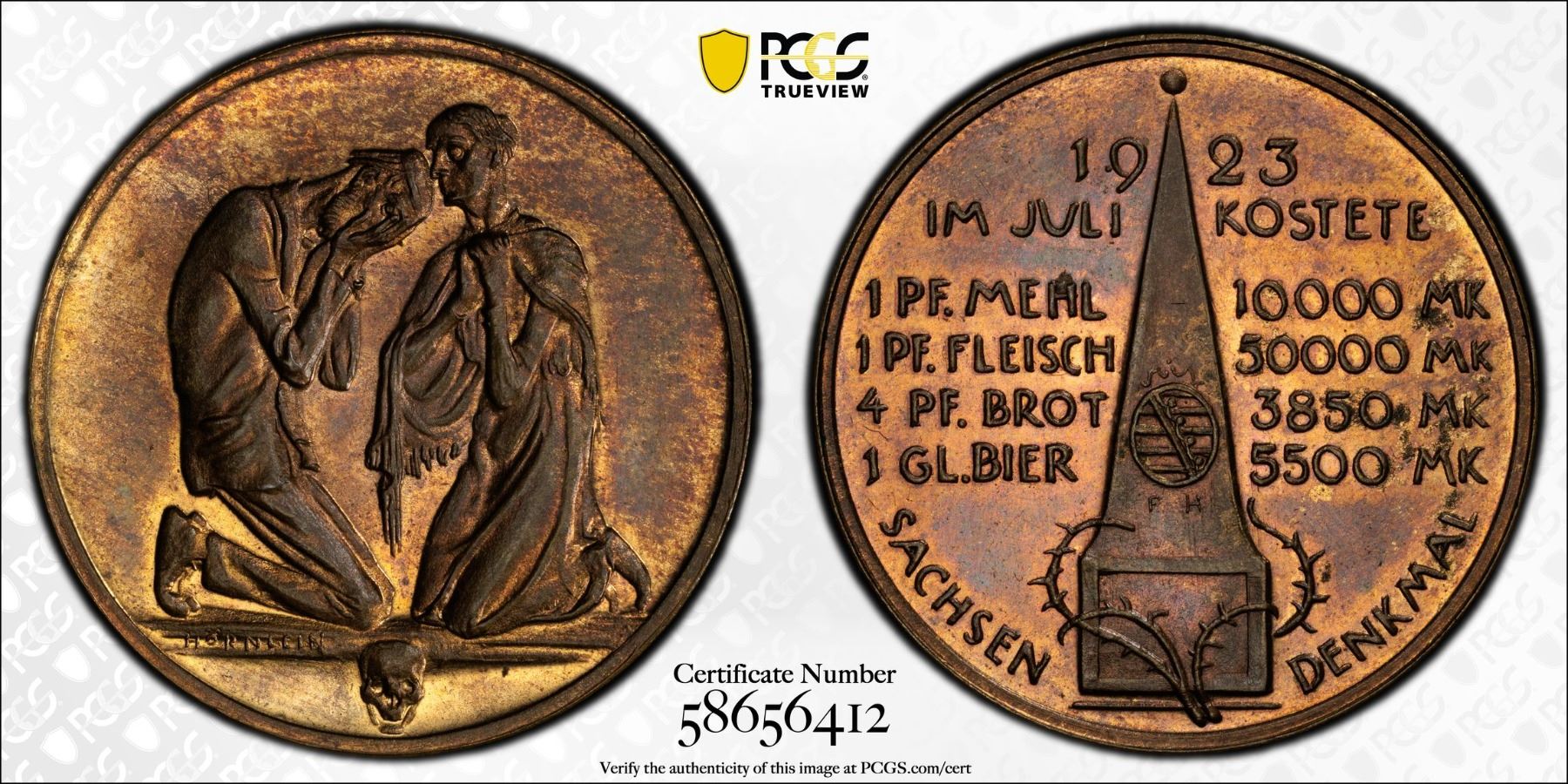 SAXONY: Weimar Republic, AE inflation medal, 1923, J-71, 38mm bronze "Hörnlein" medal; kneeling man to the right covering his face with his hands and kneeling woman to the left, wringing his raised hands, skull below // SACHSEN DENKMAL either side below obelisk surrounded by thorns with the Saxon state coat of arms, on either side inflationary prices, 1923 / IM Juli KOSTETE / 1 PF. MEHL 1000 MK / 1 PF. FLEISCH 4000 MK 4 PF. BROT = 700 MK / 1 GL. BIER = 600 MK, a wonderful mint state example! PCGS graded MS64 RB. During the Weimar Republic's hyperinflation of 1923, Sachsen (Saxony) saw the creation of "Hörnlein" medals, a form of emergency currency and satirical commentary on the soaring prices, featuring images and text reflecting the extreme economic hardship.