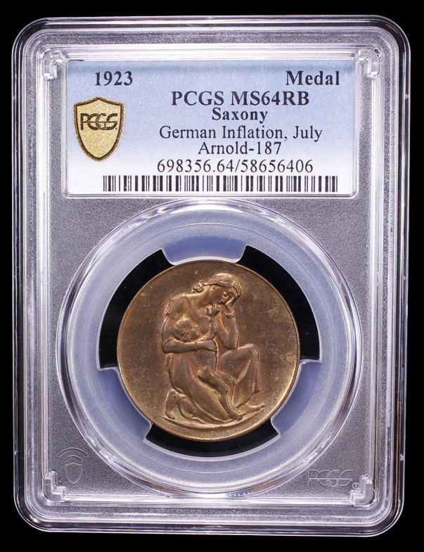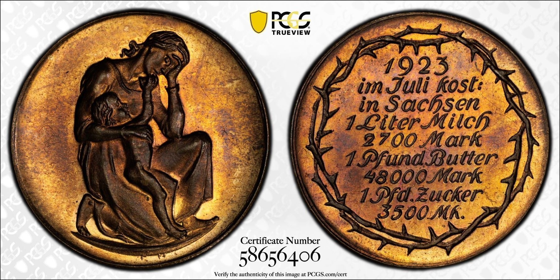 SAXONY: Weimar Republic, AE inflation token, 1923, AFA-187, J-66, 29mm bronze "Hörnlein" medal; crouching woman in a pose of despair holding her arm over the shoulder of a nude child // 1923 / IM JULI KOST: / IN SACHSEN / 1 LITER MILCH /2700 MARK / 1 PFUND BUTTER / 48000 MARK / 1 PFD. ZUCKER / 3500 MK., within wreath of thorns, a wonderful mint state example! PCGS graded MS64 RB. During the Weimar Republic's hyperinflation of 1923, Sachsen (Saxony) saw the creation of "Hörnlein" medals, a form of emergency currency and satirical commentary on the soaring prices, featuring images and text reflecting the extreme economic hardship. .