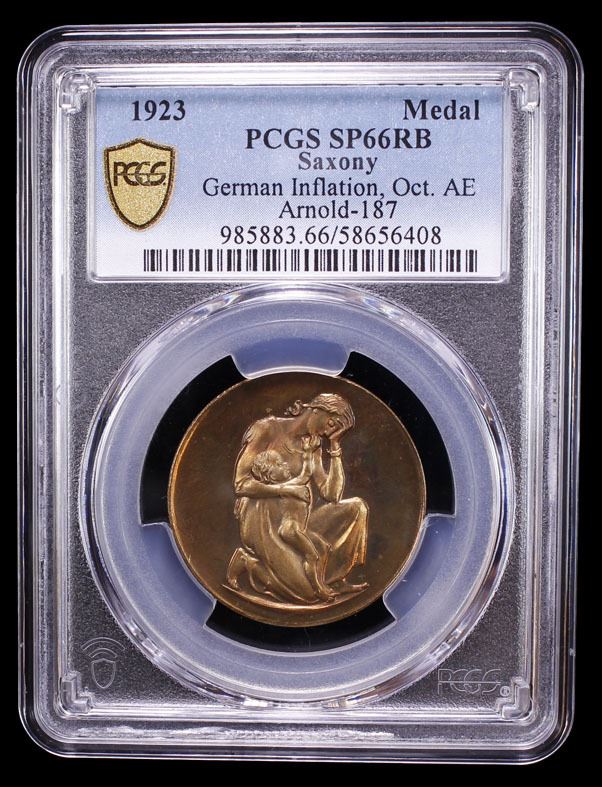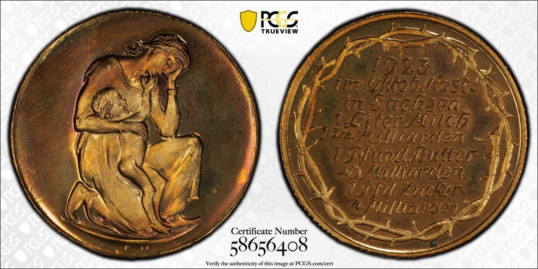 SAXONY: Weimar Republic, AE inflation token, 1923, AFA-189, J-68, 29mm bronze "Hörnlein" medal; crouching woman in a pose of despair holding her arm over the shoulder of a nude child // 1923 / IM OKTOB. KOST: / IN SACHSEN / 1 LITER MILCH / 1 MILLIARDEN / 1 PFUND BUTTER / 40 MILLIARDEN / 1 PFD. ZUCKER / 4 MILLIARDEN, within wreath of thorns, a fantastic specimen quality example! PCGS graded Specimen 66 RB. During the Weimar Republic's hyperinflation of 1923, Sachsen (Saxony) saw the creation of "Hörnlein" medals, a form of emergency currency and satirical commentary on the soaring prices, featuring images and text reflecting the extreme economic hardship. .