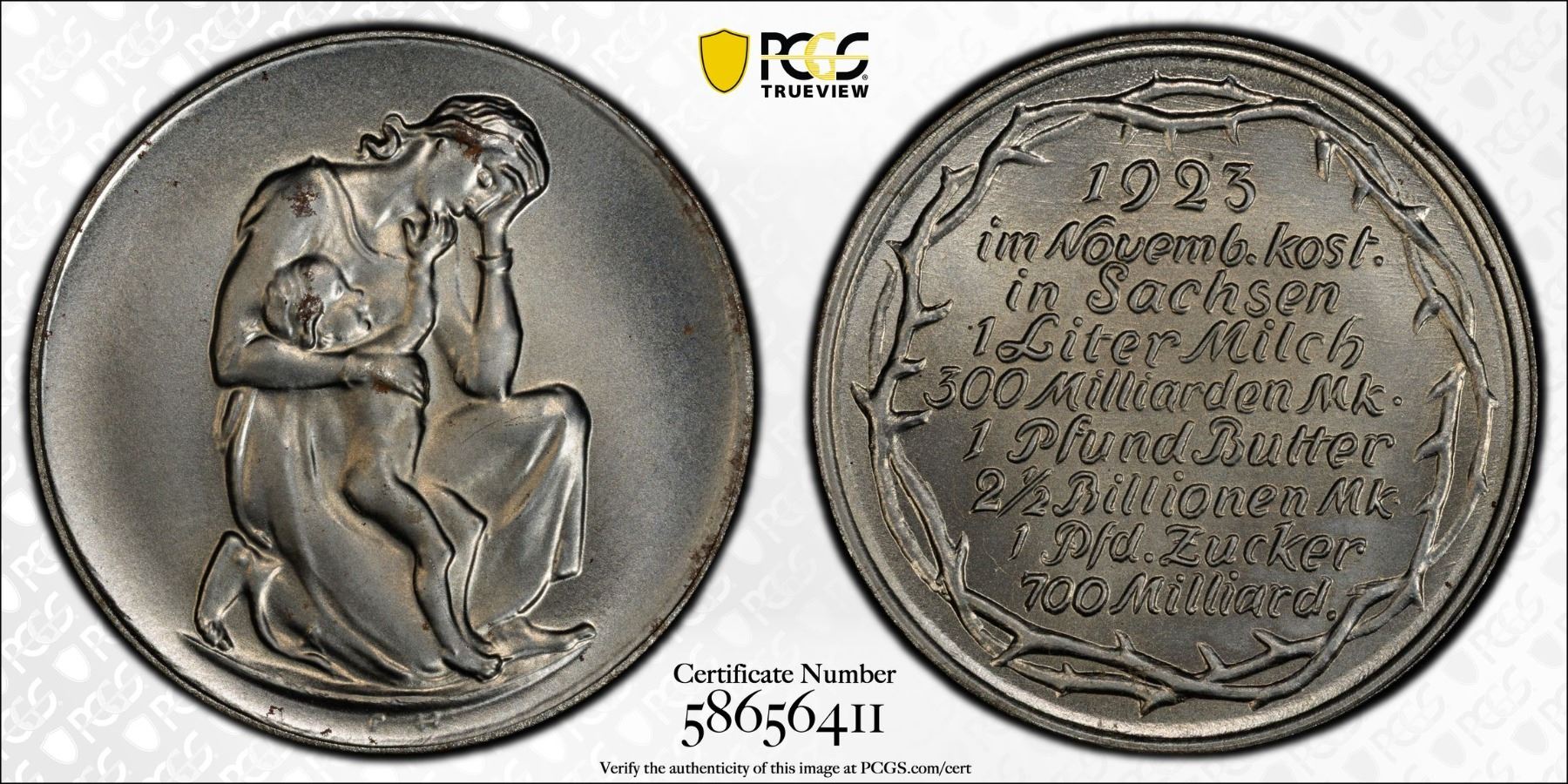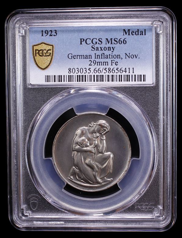 SAXONY: Weimar Republic, iron inflation token, 1923, J-71, 29mm iron "Hörnlein" medal; crouching woman in a pose of despair holding her arm over the shoulder of a nude child // 1923 / IM NOVEMB. KOST: / IN SACHSEN / 1 LITER MILCH / 300 MILLIARDEN MK. / 1 PFUND BUTTER / 2½ BILLIONEN MK. / 1 PFD. ZUCKER / 700 MILLIARRD., within wreath of thorns, a fantastic mint state example! PCGS graded MS66. During the Weimar Republic's hyperinflation of 1923, Sachsen (Saxony) saw the creation of "Hörnlein" medals, a form of emergency currency and satirical commentary on the soaring prices, featuring images and text reflecting the extreme economic hardship.