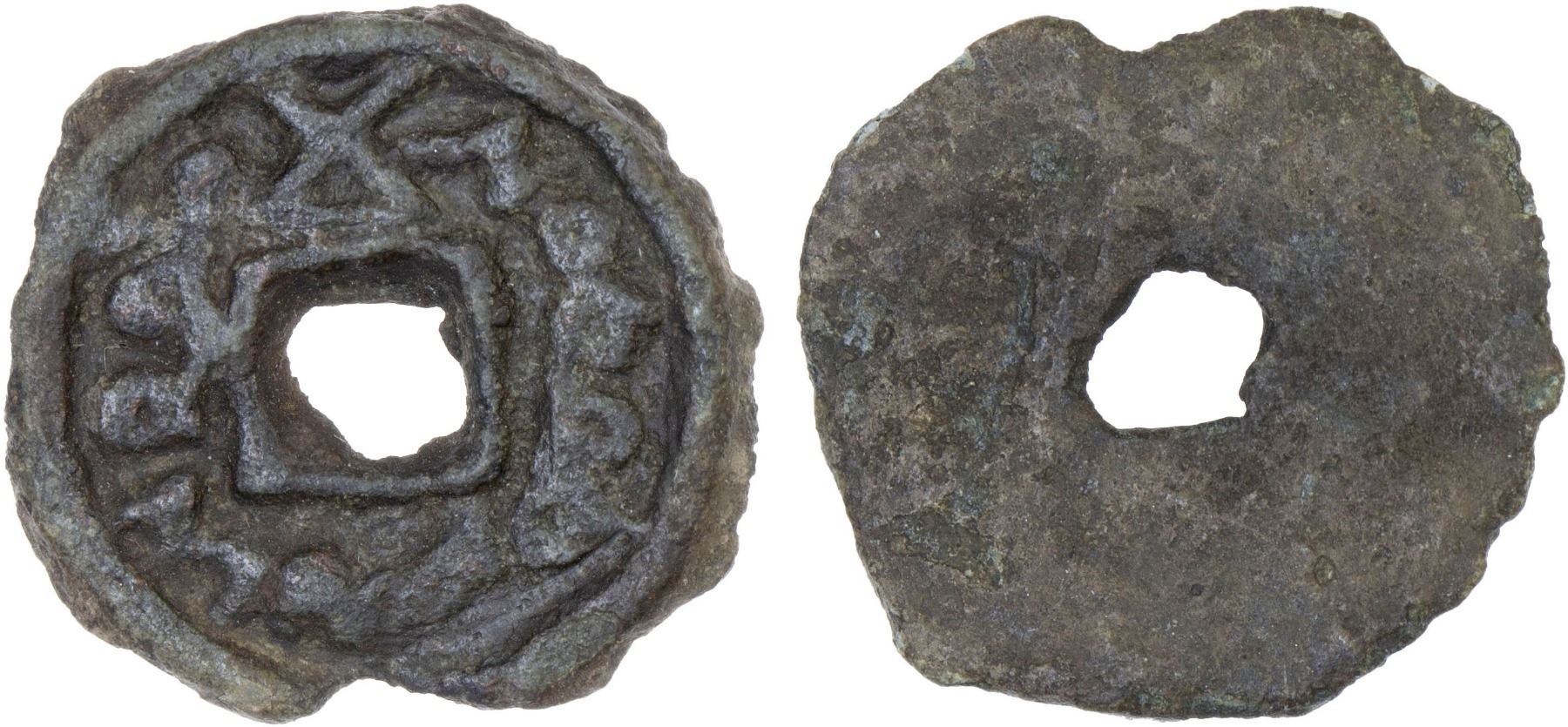 SAYRAM: Anonymous, 8th century, AE cash (1.20g), Zeno-289244, lion advancing right on ground line // Otrar tamgha in center, Runic symbols above & below, Sogdian legend left & right, blank reverse, VF, R.