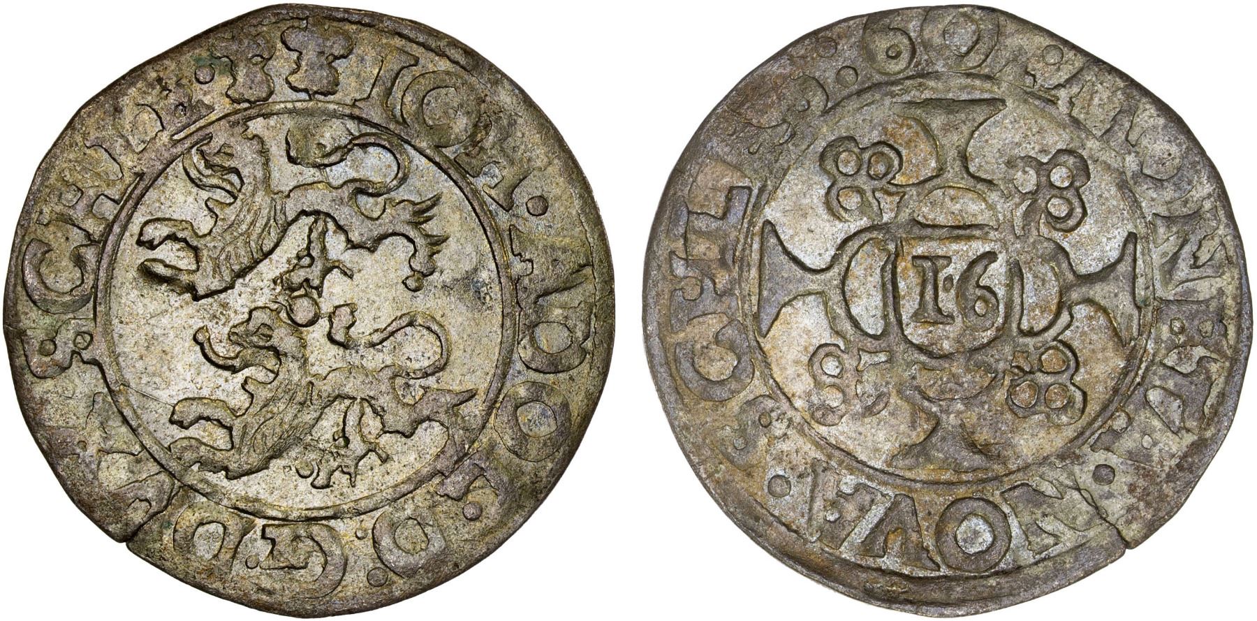SCHLESWIG-HOLSTEIN-GOTTORP: Johann Adolf, 1590-1616, AR 1/16 thaler (1)601, KM-5, Lange-286var, reverse legend: ends SCHLES:, with old dealer tag, lightly toned, VF-XF, S, ex H. G. Oldenburg.