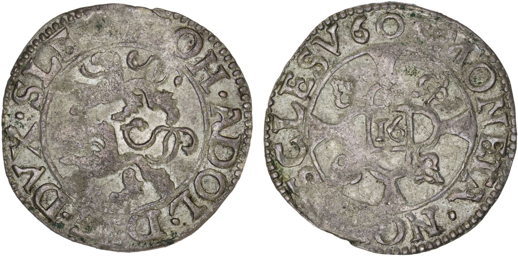 SCHLESWIG-HOLSTEIN-GOTTORP: Johann Adolf, 1590-1616, AR 1/16 thaler (1)603, KM-5, Lange-288var, obverse legend: .IOH.ADOL.D:G.DVX.SLE, reverse legend:MONETA.NOVA.SCLESV603, somewhat uneven strike, small edge defect at 12:00, a few faint reverse scratches, with old dealer tag, toned, VF-XF, S, ex H. G. Oldenburg.