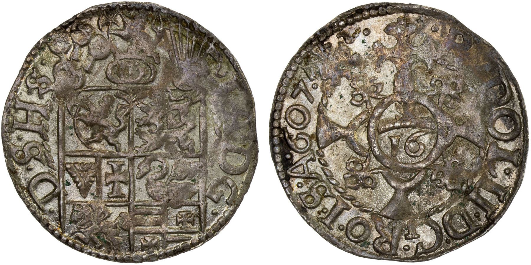 SCHLESWIG-HOLSTEIN-GOTTORP: Johann Adolf, 1590-1616, AR 1/16 thaler (1)607, KM-12, Lange-291var, a couple minor differnces in the stop pattern versus the standard type, uneven tone, nice strike for these, with old dealer tag, AU.