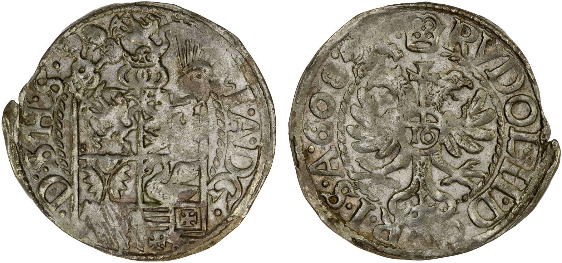SCHLESWIG-HOLSTEIN-GOTTORP: Johann Adolf, 1590-1616, AR 1/16 thaler, [1]608, Lange-292var, type unlisted in KM, 4-fold arms with 3 helmets above // "1/16" on double headed eagle's breast, obverse legend: I.A.DG. - .D:S.H.S., reverse legend: .RVDOL.II.D g - R.I.S.A.608., somewhat uneven strike, edge defect at 9:00, some luster, with old auction tag, VF-XF, ex H. G. Oldenbrug Auction 26-27 February 1987, Lot 1318.
