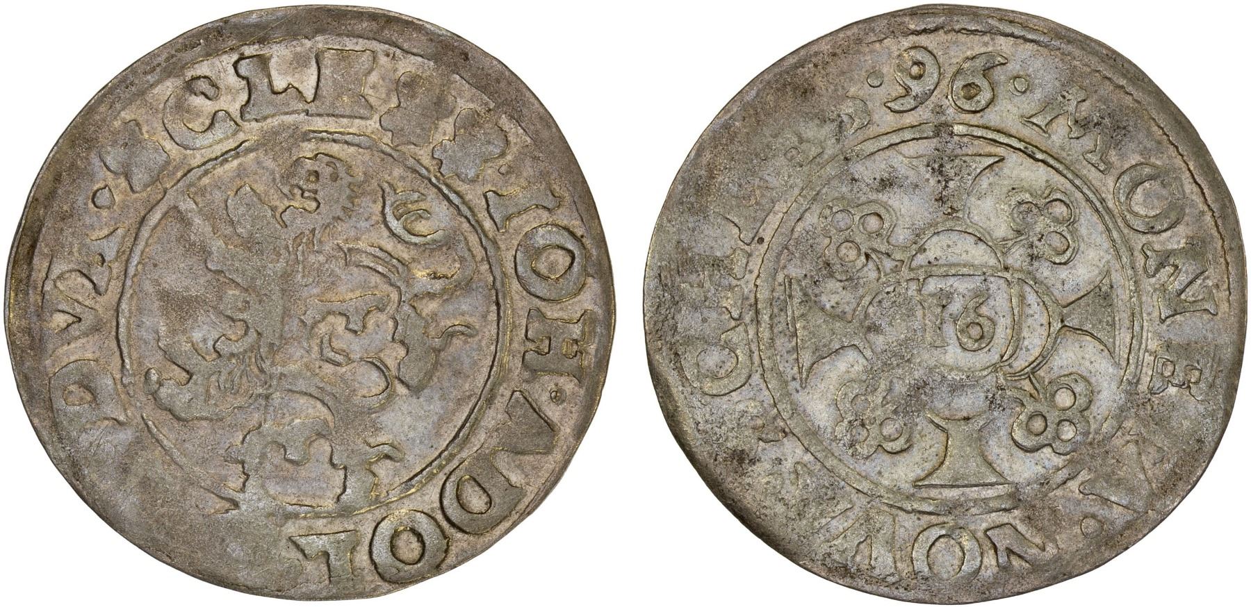 SCHLESWIG-HOLSTEIN-GOTTORP: Johann Adolf, 1590-1616, AR 1/16 thaler (15)96, KM-5, Lange-281a, obverse legend ends ...SCLE., reverse legend ends .SCHLES., somewhat uneven strike, traces of luster, VF-XF, S, ex H. G. Oldenburg.