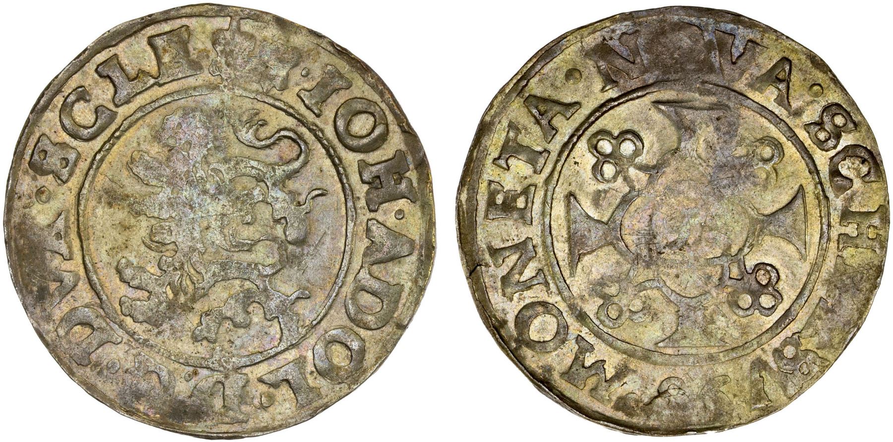 SCHLESWIG-HOLSTEIN-GOTTORP: Johann Adolf, 1590-1616, AR 1/16 thaler (15)96, KM-5, Lange-281a/c, obverse legend ends ...SCLE., reverse legend ends .SCHLESV., somewhat uneven strike, some luster, light yellowish tone, with old dealer tag, XF, S, ex H. G. Oldenburg.