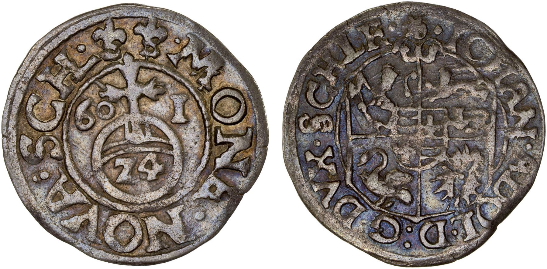 SCHLESWIG-HOLSTEIN-GOTTORP: Johann Adolf, 1590-1616, AR 1/24 thaler, [1]601, KM-8var, Lange-300c var, reverse legend:MONE.NOVA.SCHL., with old dealer tag, VF, ex H. G. Oldenburg.