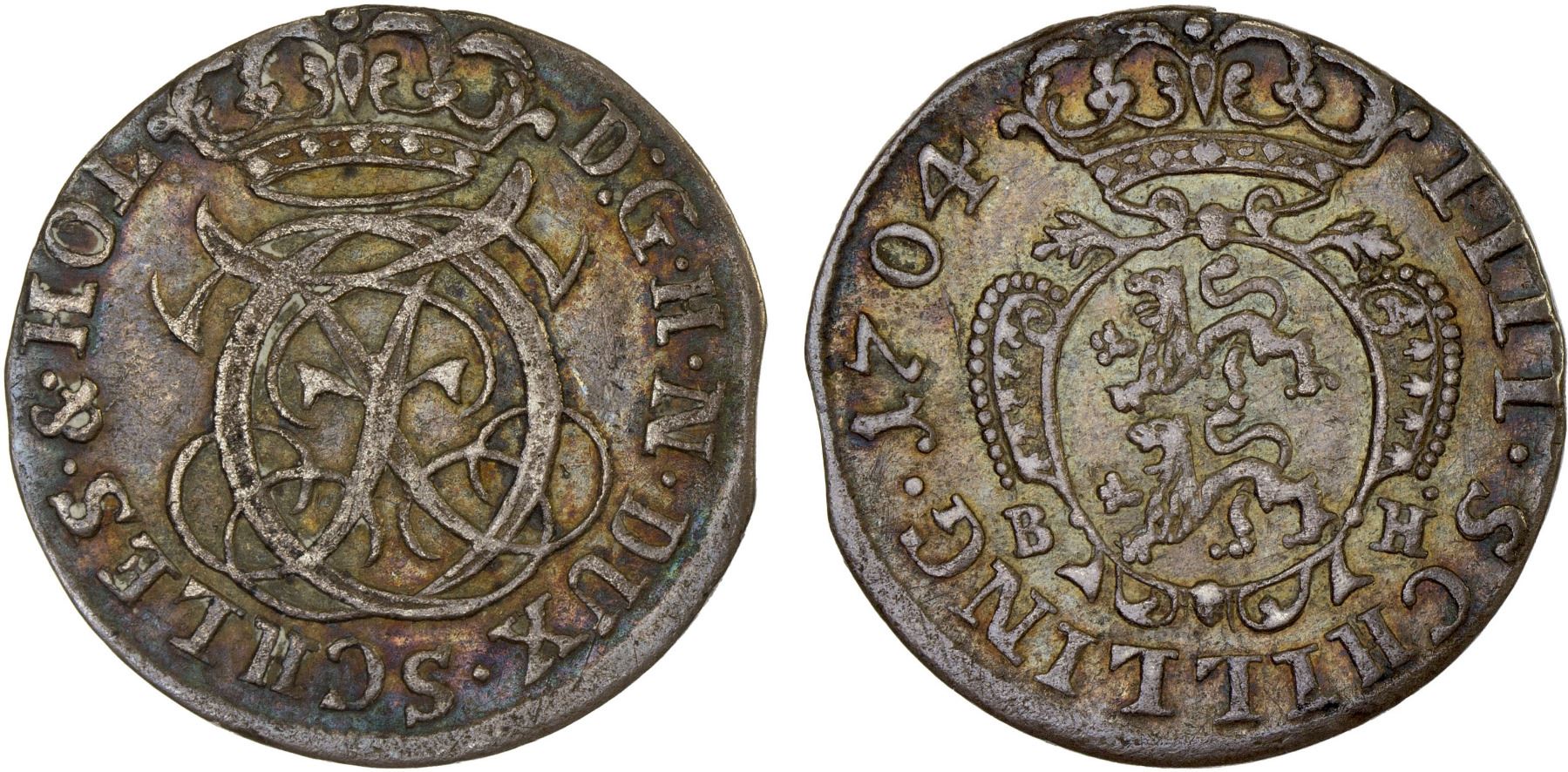 SCHLESWIG-HOLSTEIN-GOTTORP: Karl Friedrich, 1702-1739, AR 4 schilling, 1704, KM-185, Lange-459b var, initials BH, varies from standard type with colon between D G in obverse legend, miniscule edge clip error, light attractive tone, VF-XF, ex H. G. Oldenburg.