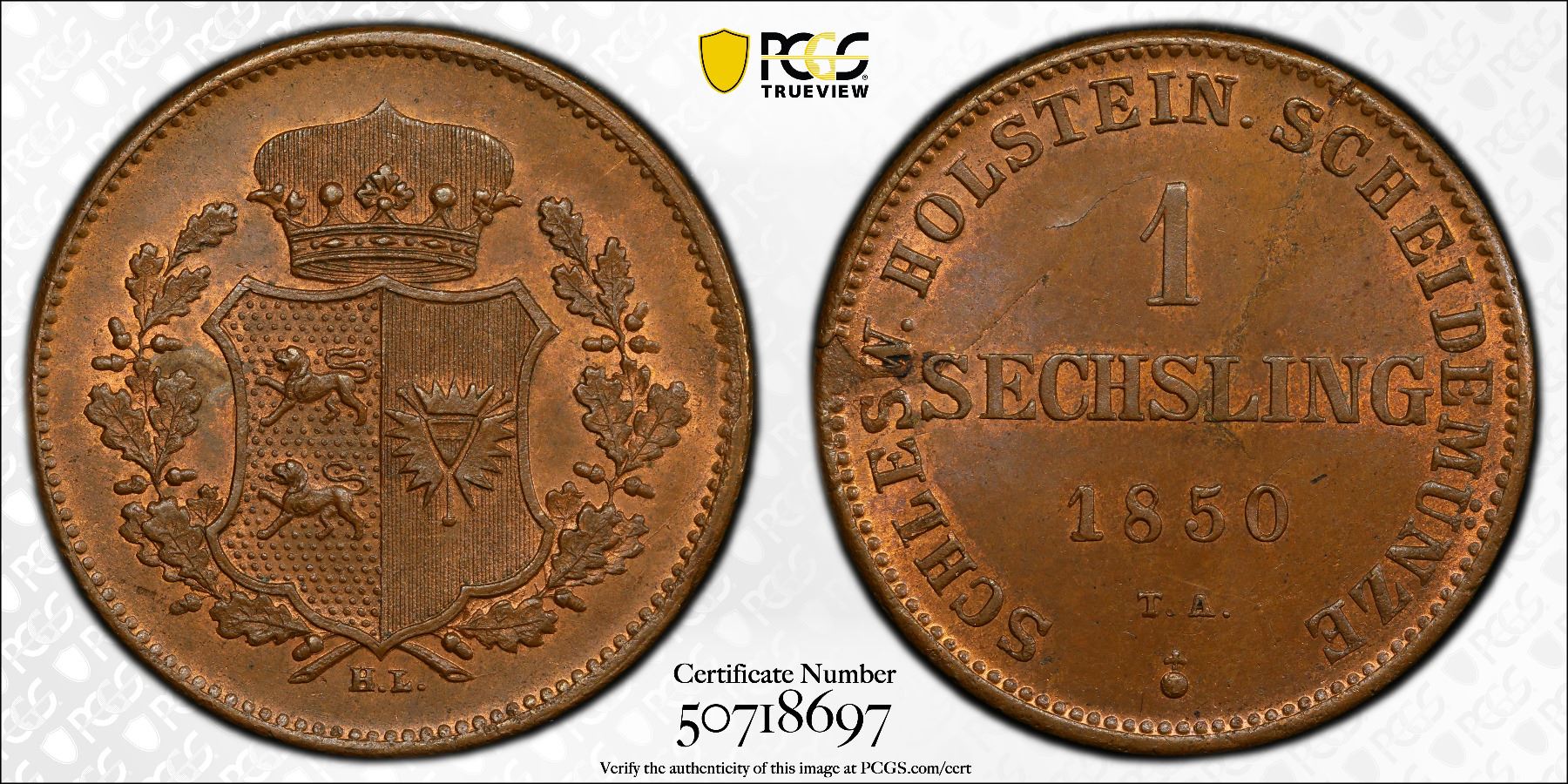 SCHLESWIG-HOLSTEIN: Rebel Provisional Government, AE sechsling, 1850, KM-162, C-24, mint master initials TA, a wonderful lustrous chocolate brown mint state example! PCGS graded MS64 BN, ex Joe Sedillot Collection. In 1850, Schleswig-Holstein’s bid for independence from Denmark collapsed after Denmark's victory at the Battle of Idstedt and Prussia's withdrawal of support. Schleswig-Holstein rebels, who wanted independence from Denmark and unification with the German Confederation, had initially been supported by Prussia, but Prussia withdrew its support in 1850 due to diplomatic pressure. Although the war officially continued until 1851, by 1850, Denmark, backed diplomatically by the Great Powers of Britain and Russia was regaining control, ending the First Schleswig War in Denmark’s favor.