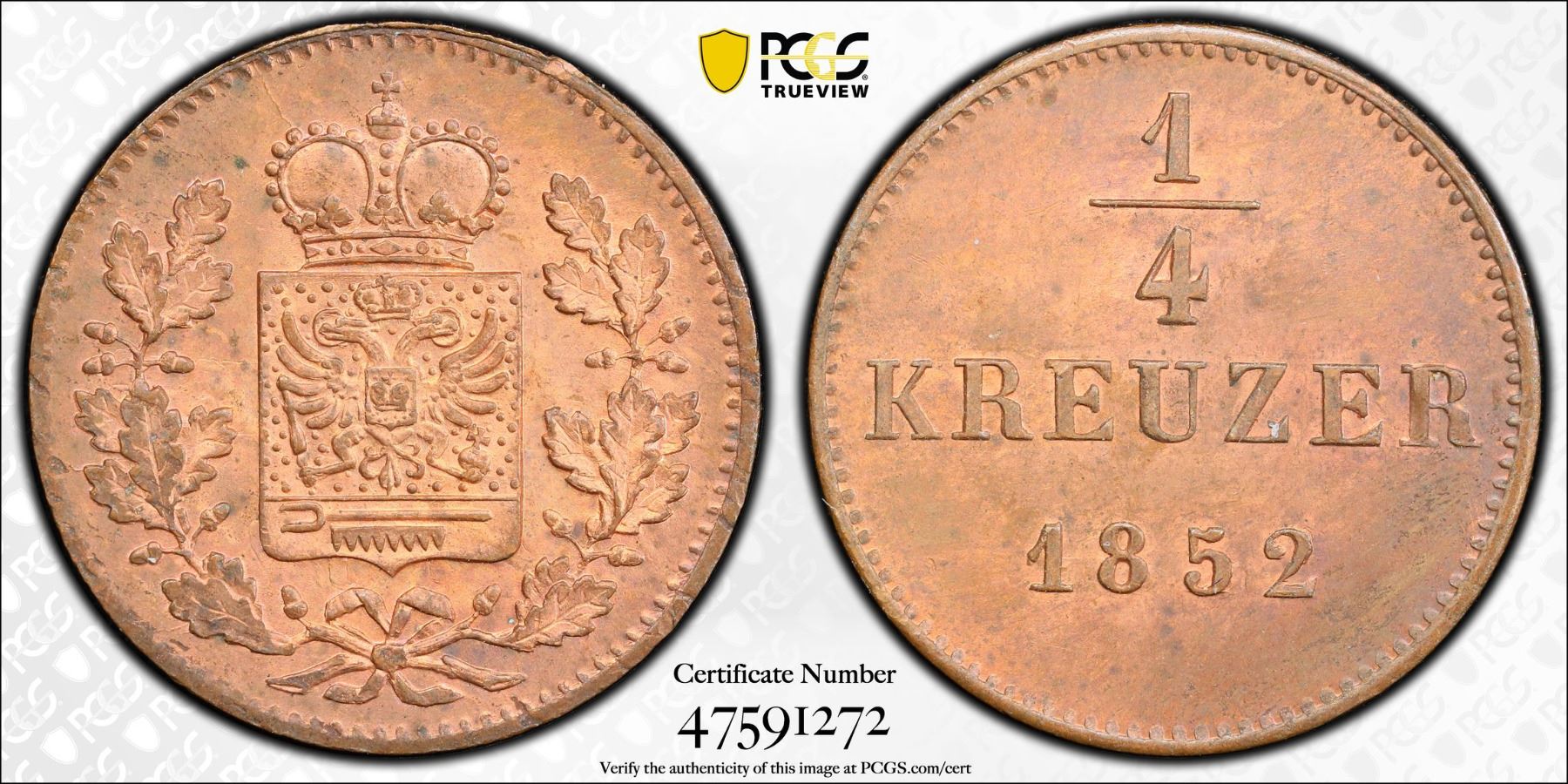 SCHWARZBURG-RUDOLSTADT: Frederick Gunther, 1814-1867, AE ¼ kreuzer, 1852, PCGS MS64 RB