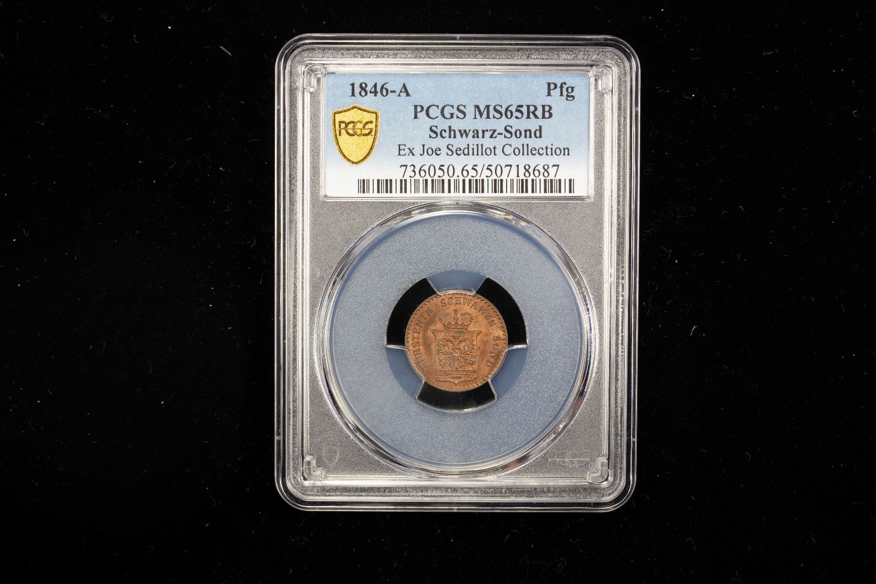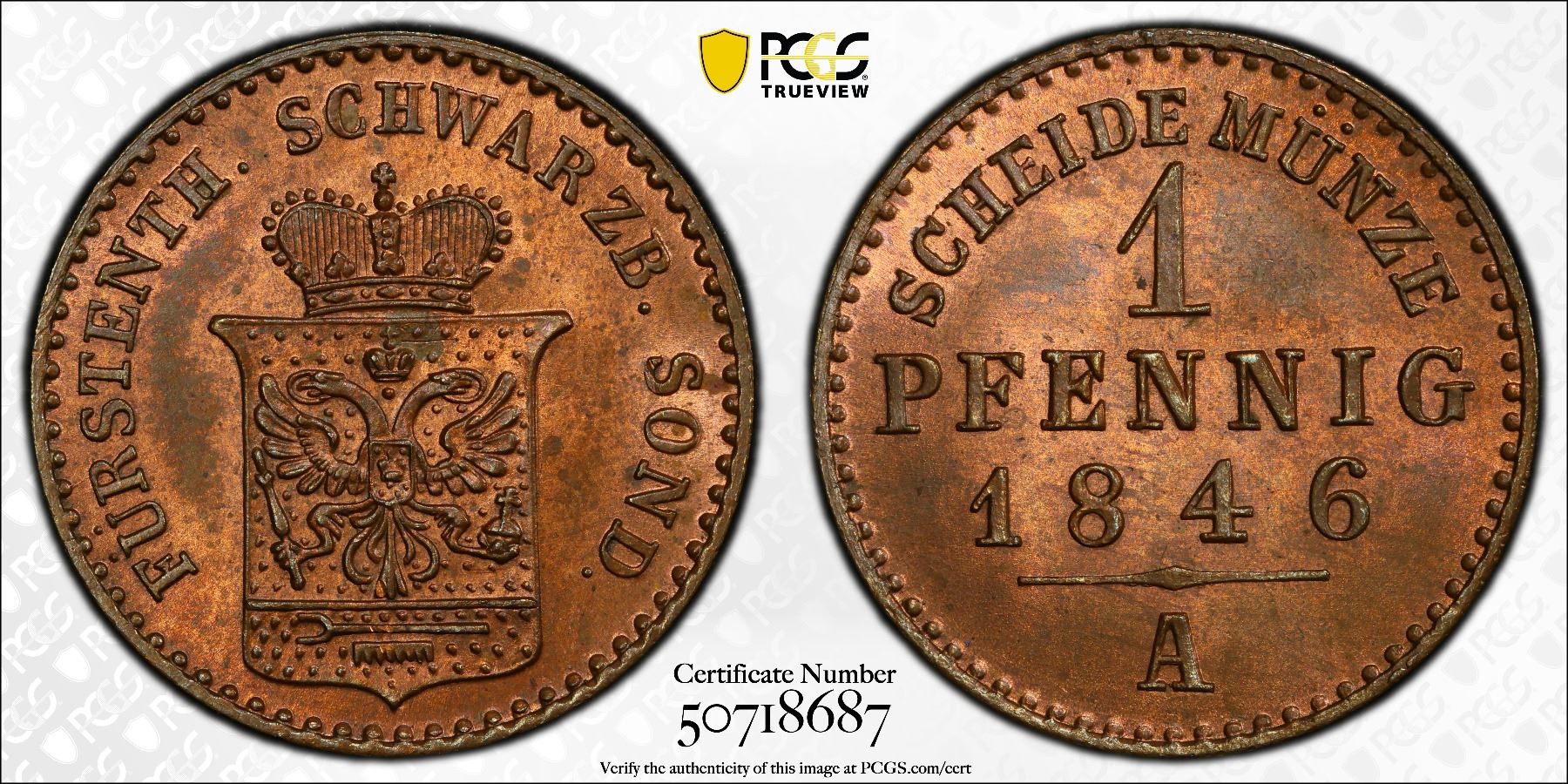 SCHWARZBURG-SONDERSHAUSEN: Günther Friedrich Karl II, 1835-1880, AE pfennig, 1846-A, KM-142, C-18, a superb lustrous caramel red brown mint state example! PCGS graded MS65 RB, ex Joe Sedillot Collection. In 1846, Schwarzburg-Sondershausen was a quiet, conservative principality under Prince Günther Friedrich Carl II, experiencing the same pre-revolutionary tensions affecting much of Germany. While no major events occurred, the state was on the brink of the broader upheavals that would arrive with the 1848 revolutions.