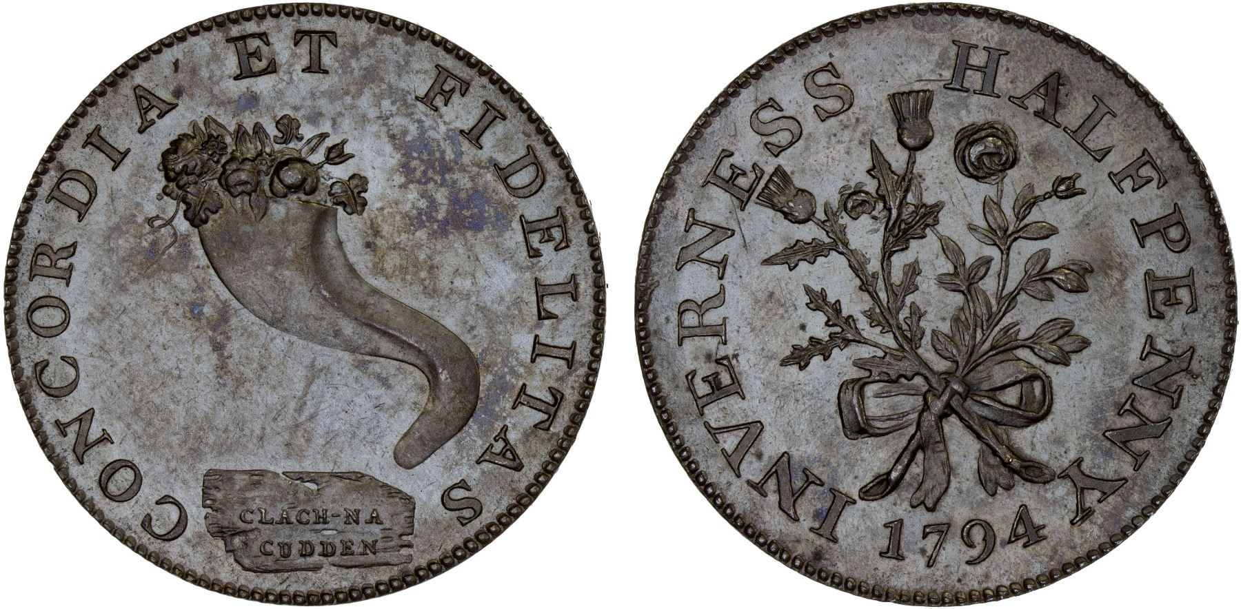SCOTLAND: AE halfpenny token (10.10g), 1794, D&H-Invernesshire 2, 29mm bronzed Inverness halfpenny, variety without the "I" before WILSON'S in the edge lettering, rose and thistle tied together with "INVERNESS HALFPENNY - 1794", cornucopia with CONCORDIA ET FIDELITAS around and stone below inscribed CLACH-NA / CUDDEN, a few reverse hairlines, lovely chocolate-brown coloration, PAYABLE AT MACKINTOSH INGLIS & WILSON'S on edge, Choice Proof.