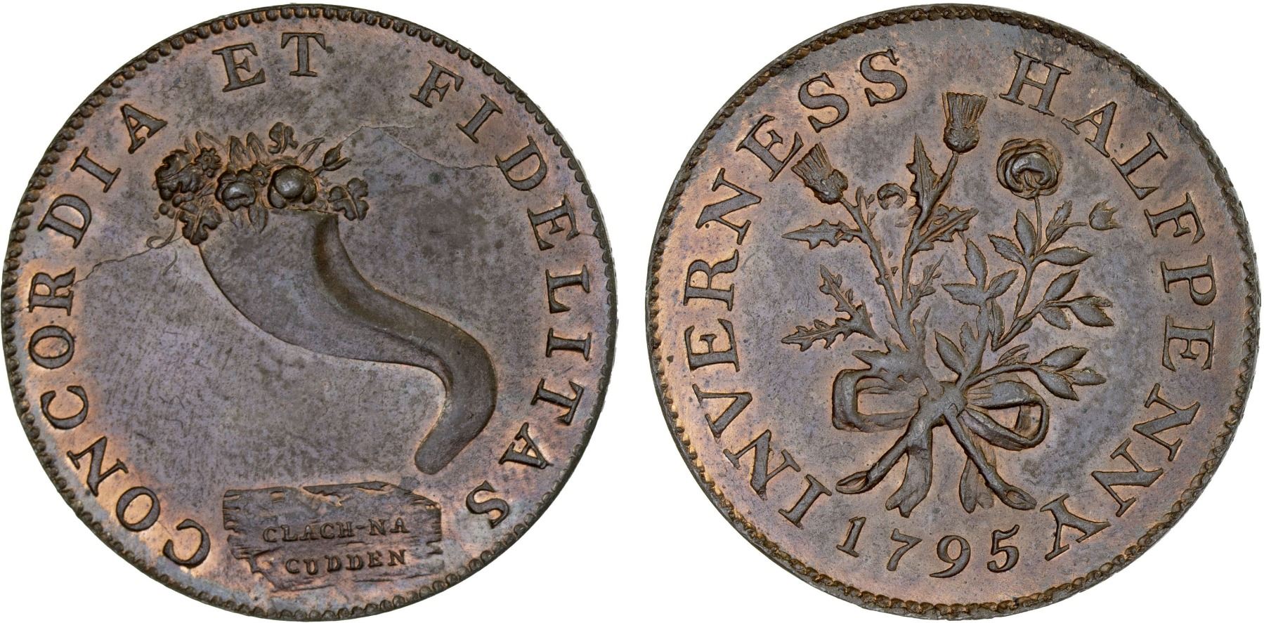 SCOTLAND: AE halfpenny token (9.76g), 1795, D&H-Invernesshire 3a, 29mm Inverness halfpenny, variety without the "I" before WILSON'S and dash after WILSON'S omitted in the edge lettering, rose and thistle tied together with "INVERNESS HALFPENNY - 1795", cornucopia with CONCORDIA ET FIDELITAS around and stone below inscribed CLACH-NA / CUDDEN, red and brown, PAYABLE AT MACKINTOSH INGLIS & WILSON'S on edge, Choice UNC.