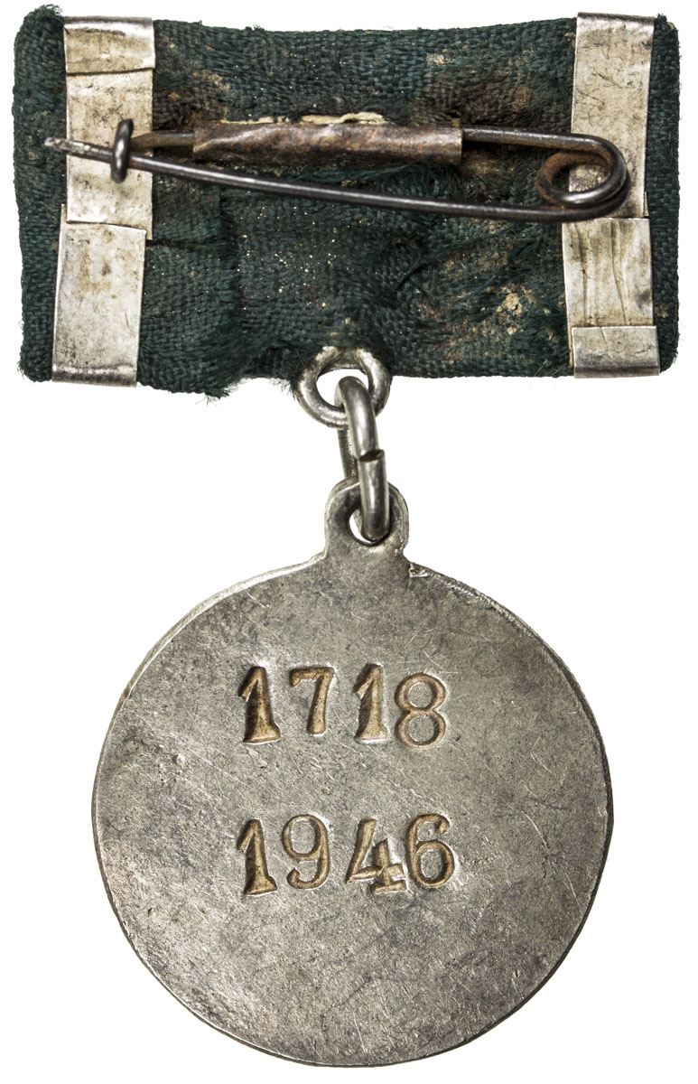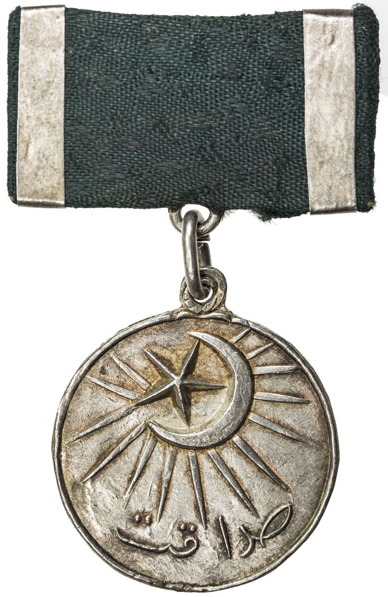 SECOND EAST TURKISTAN REPUBLIC: 1944-1949, AR medal, 1946, 32mm, with original loop and ribbon, shining star & crescent, sadaqat ("loyalty") below in Uyghur script // punched date & award number (#1718), choice EF, RR. The East Turkestan Republic's Orders and medals were all instituted in 1945, the same year as the Ili National Army was formed. They are little known and all are extremely rare. This is the first example we have seen with the original ribbon, clipped to the hanger with a old paperclip.