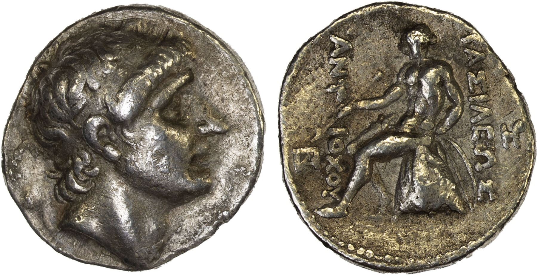 SELEUKID KINGDOM: Antiochos I Soter, 281-261 BC, AR tetradrachm (15.04g), Seleukia on the Tigris, SC-379.1, diademed head right // Apollo seated left on omphalos, holding arrow and resting hand on grounded bow, monogram to outer left and outer right, faint graffiti on obverse, light scratches on both sides, VF.