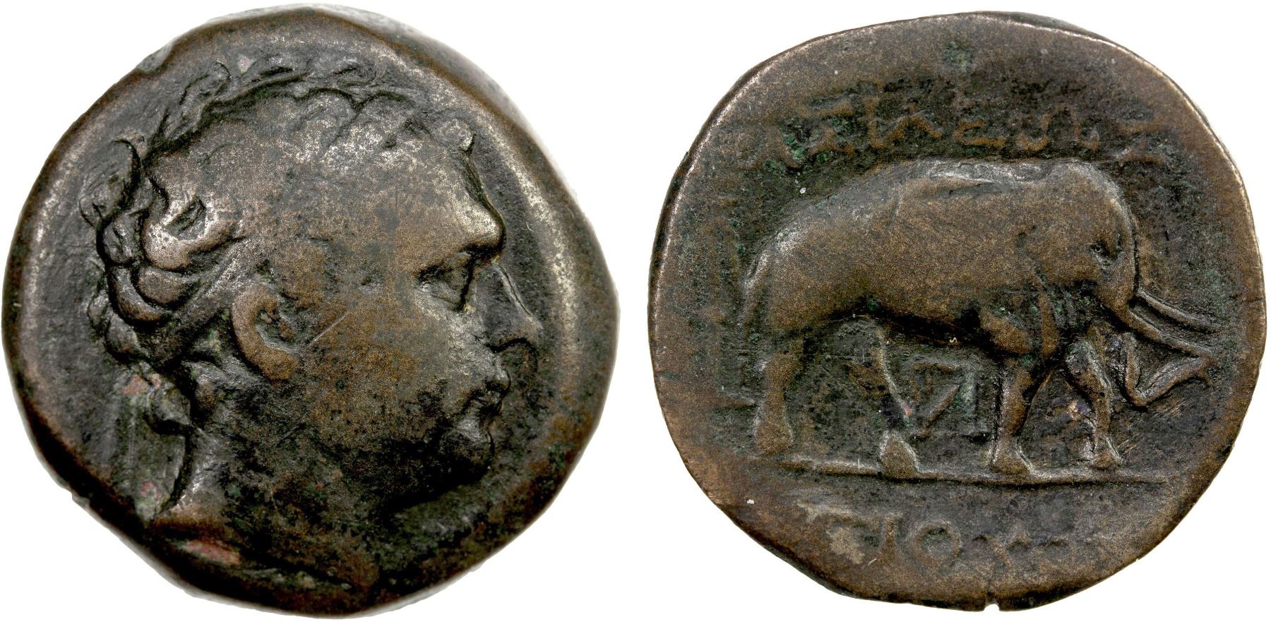 SELEUKID KINGDOM: Antiochos III "The Great", 222-187 BC, AE unit (16.84g), uncertain mint 73, ca. 210 BC, SC-1275b, issued by military mint associated with Ecbatana, diademed head right // elephant walking right, anchor behind, symbol below stomach, a few light scratches, Fine.