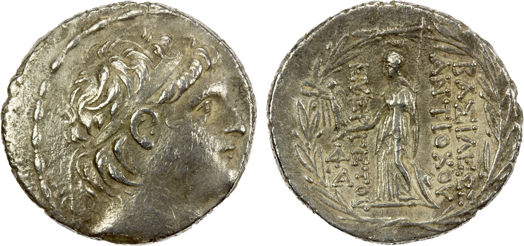 SELEUKID KINGDOM: Antiochos VII Euergetes (Sidetes), 138-129 BC, AR tetradrachm (14.96g), Antioch on the Orontes, SC-2061.2, diademed head right // Athena Nikephoros standing left, monogram above A to outer left, all within laurel wreath, small marks and cleaning, Choice VF.