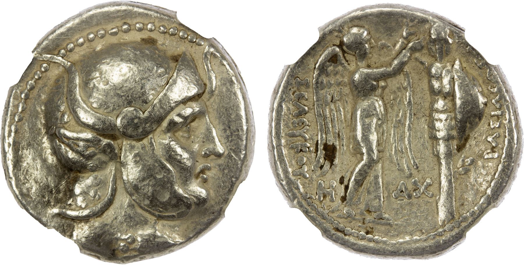 SELEUKID KINGDOM: Seleukos I Nikator, 312-281 BC, AR tetradrachm (16.97g), Susa, ca. 305-295 BC, SC-173.12, helmeted head (perhaps Alexander or Seleukos) right, wearing helmet covered with panther skin and decorated with bull ear and horns // Nike standing right, crowning trophy, H to lower left, AX below, BAΣIΛEΩΣ / ΣEΛEYKOY, light marks, Strike 5/5, Surface 3/5, NGC graded Choice Fine.