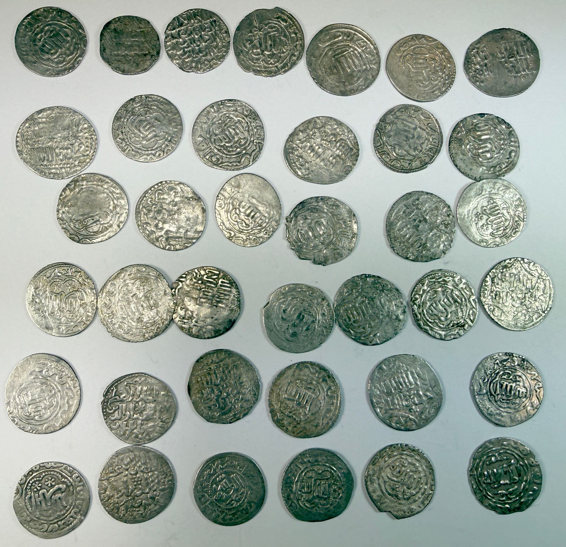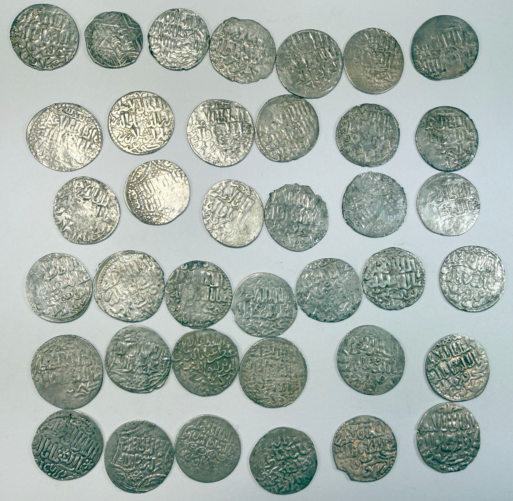 SELJUQ OF RUM: LOT of 38 silver coins, including 37 coins of the Seljuqs of Rum, nearly all of Kaykhusraw III (but at least 1 each of Kayka'us II, the three brothers, Qilij Arslan IV, and Mas'ud II), mostly mint of Lu'lu'a (ony a few with legible date), and one worn Ayyubid dirham; average VF condition but all with some weakness or small flat areas; retail vallue $600.