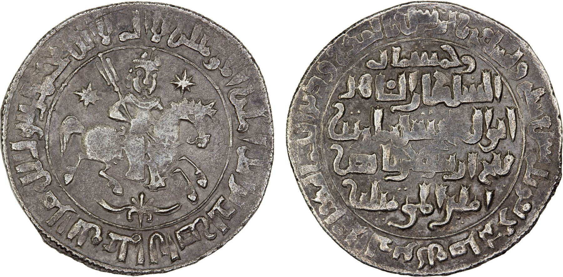 SELJUQ OF RUM: Sulayman II, 1196-1204, AR dirham (2.84g), Konya, AH597, A-1204, Izmirlier-94, mounted warrior; the earliest occurrence of this motif on circulating Islamic precious metal coinage; very rare date (only 598 is occasionally available for the Konya mint); slight weakness as usual, XF, RR. There is one peculiar word between "duriba" and city name which Izmirlier and others have not yet deciphered. It is on all Sulayman's dirhams of Konya dated 597-598.