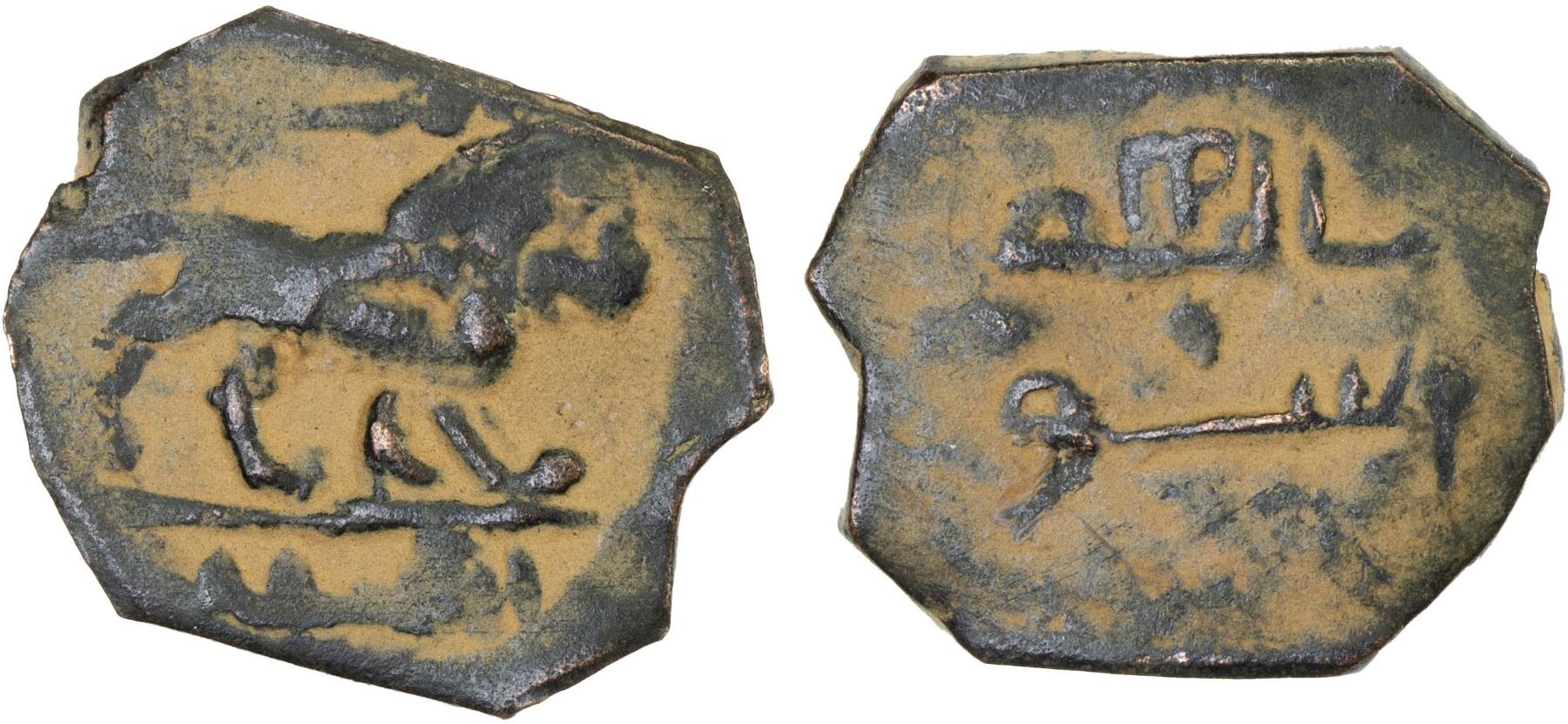 SELJUQ OF SYRIA: Anonymous, ca. 1090-1120, AE fals (3.26g), NM, ND, A-779, winged lion right, uncertain word below // part of the kalima, crude VF, RR.