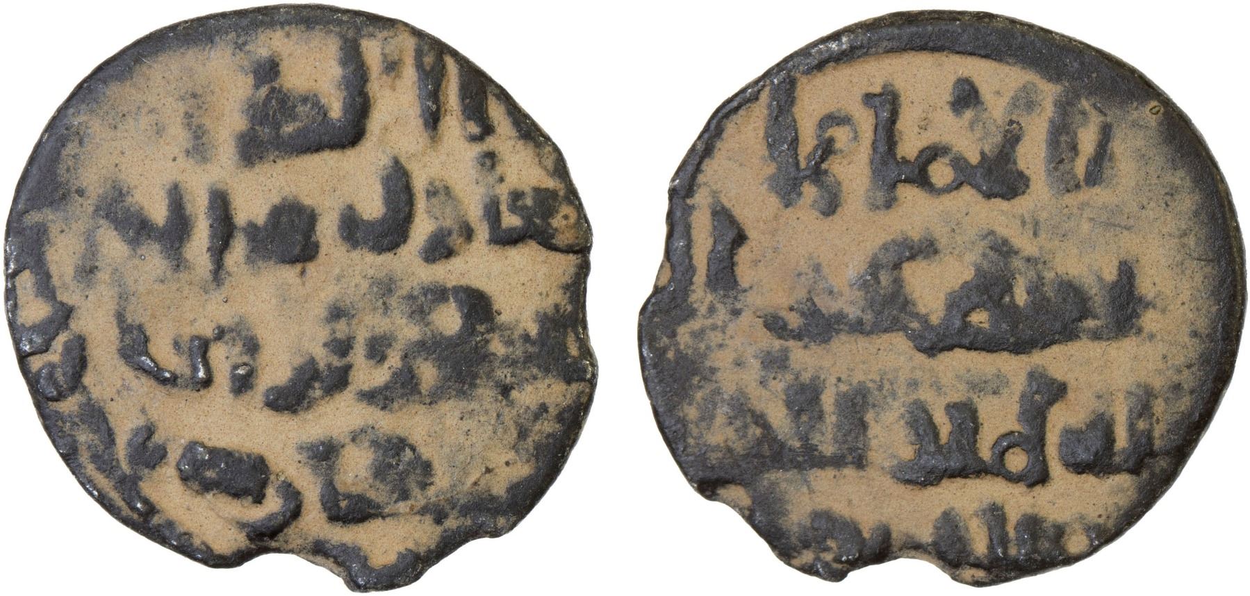 SELJUQ OF SYRIA: Ridwan, 1095-1113, BI dirham aswad (1.06g), NM, ND, A-777, crudely engraved example of Zeno-370419, which shows the ruler's name in good Arabic as al-malik al-'adil 'izz al-islam abu'l-muzaffar ridwan, and citing the Abbasid caliph al-Mustazhir on the reverse, VF, RRR.