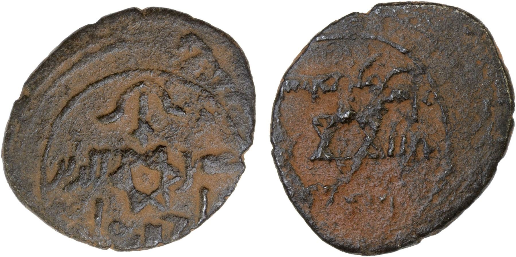 SELJUQ OF SYRIA: Tutush, 1078-1095, AE fals (2.97g), NM, ND, A-775E, Zeno-371934 (this piece), legend 'adud al-din / (wa) taj al-dawla, Seljuq bow-and-arrow symbol above, hexagram in the center // name of the caliph above (should be al-Muqtadi) and the Great Seljuq Malikshah below, also hexagram in the center; still unique and a most interesting stylized piece, VF, RRRR.