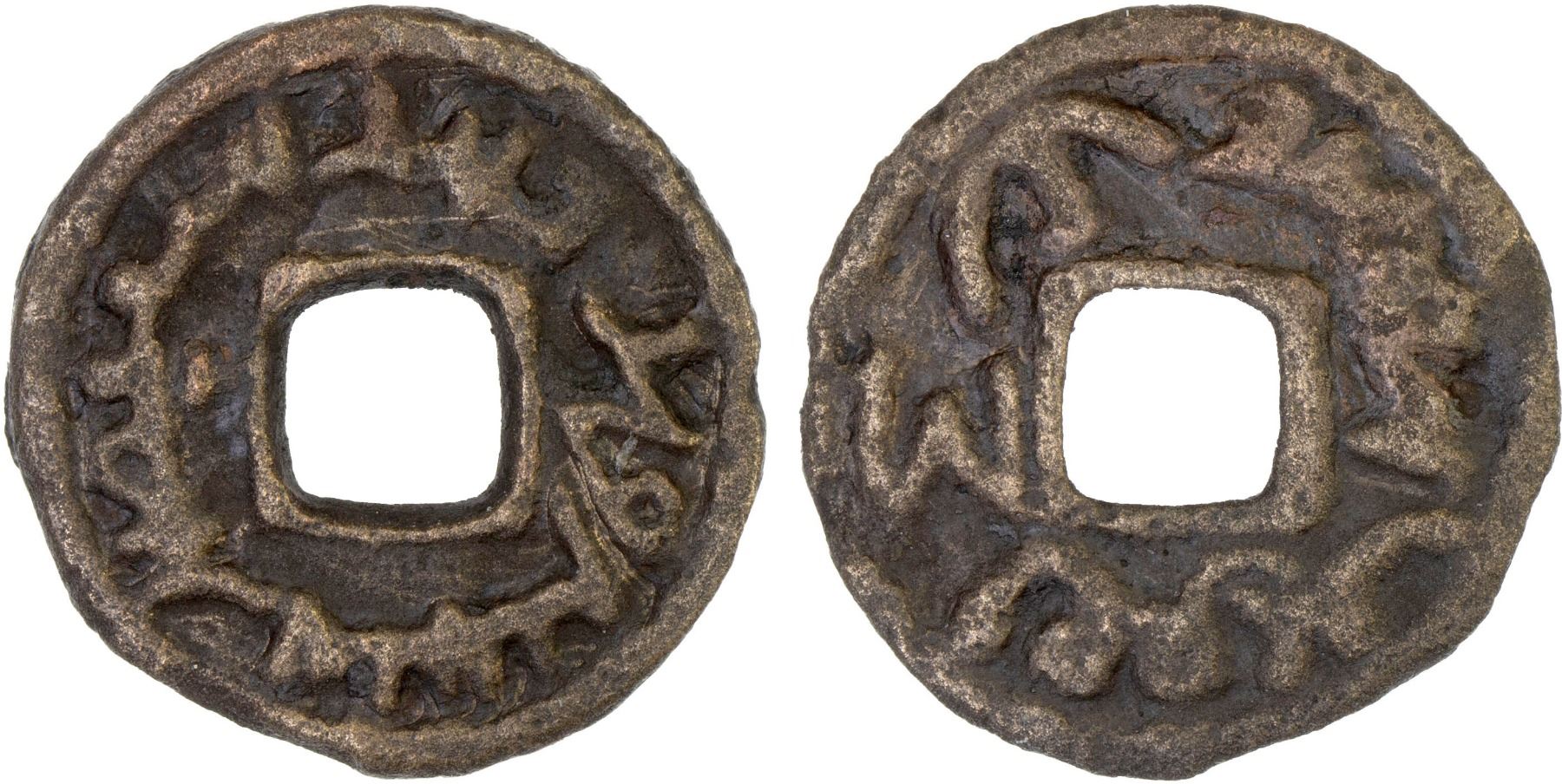 SEMIRECH'E: ARSLANID: Qarluq Qaghan Kobak, 8th century, AE cash (2.03g), Zeno-146050, Sogdian text for the Qarluq branch of the Arslanids of Semirech'e (pny bgy xralwy xagan) // ruler's name, plus two Runic-style tamghas; slight porosity, bold VF, R.